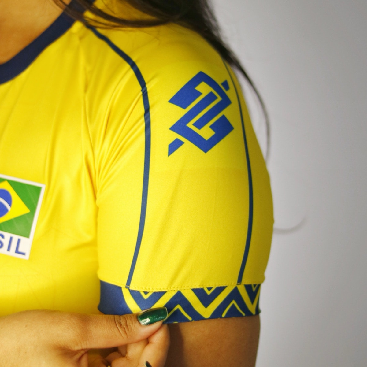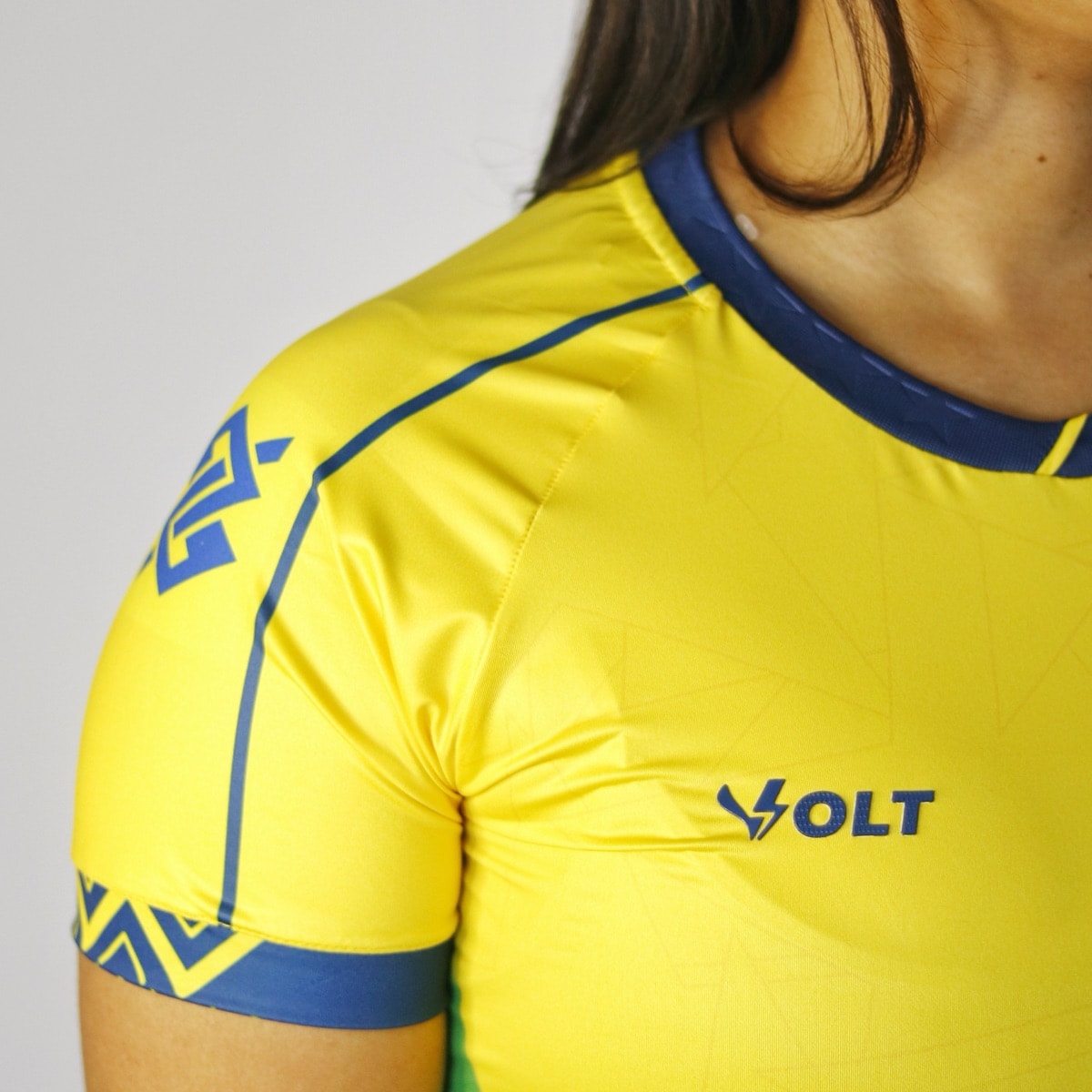 A Camisa Brasil Vôlei Feminino Jogo 1 é a expressão máxima de orgulho e performance. Em tom vibrante de amarelo, ela estampa com destaque os patrocínios da seleção e traz o escudo do Brasil em patch emborrachado no peito, ao lado do símbolo da Volt, reforçando sua autenticidade.