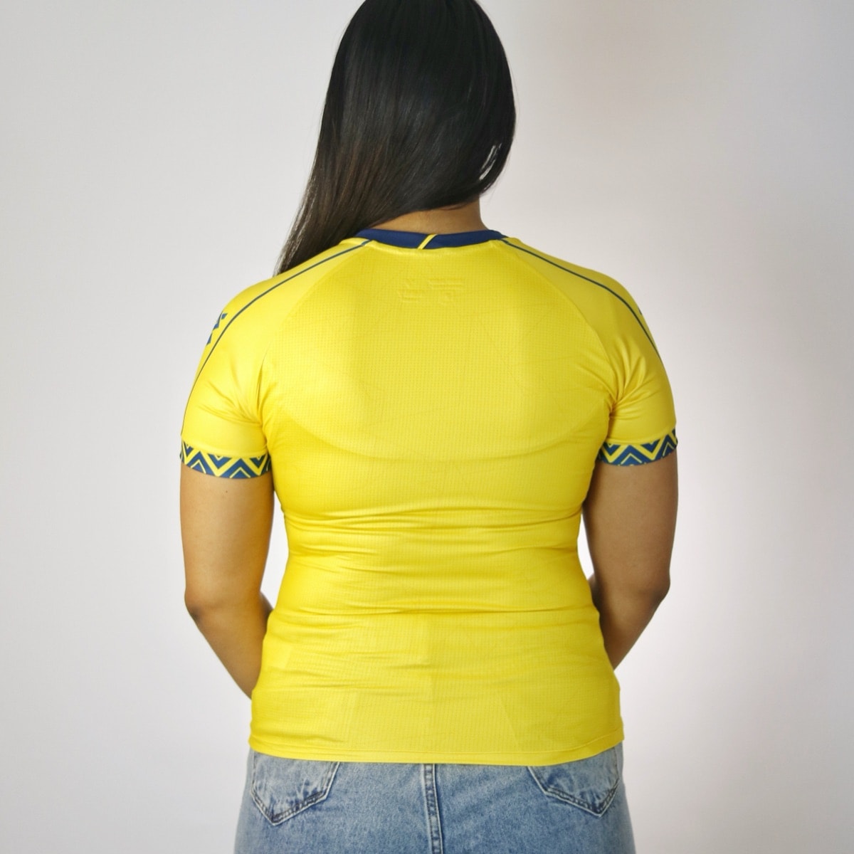 A parte frontal são confeccionadas em uma mescla de poliéster e elastano, proporcionando elasticidade, leveza e toque suave. Já as costas combinam poliéster, elastano, poliamida, entregando respirabilidade e ajuste ergonômico para a melhor performance em treinos e jogos. Os detalhes em azul e amarelo nas mangas completam o visual com elegância e identidade nacional, tornando esta peça um verdadeiro uniforme de quem joga junto com a seleção.