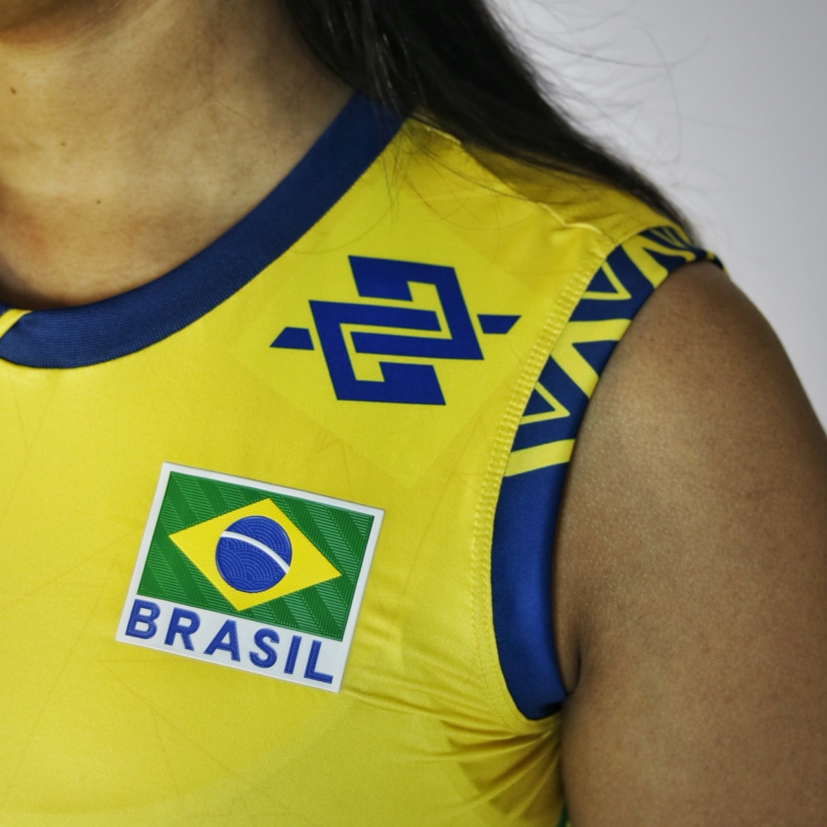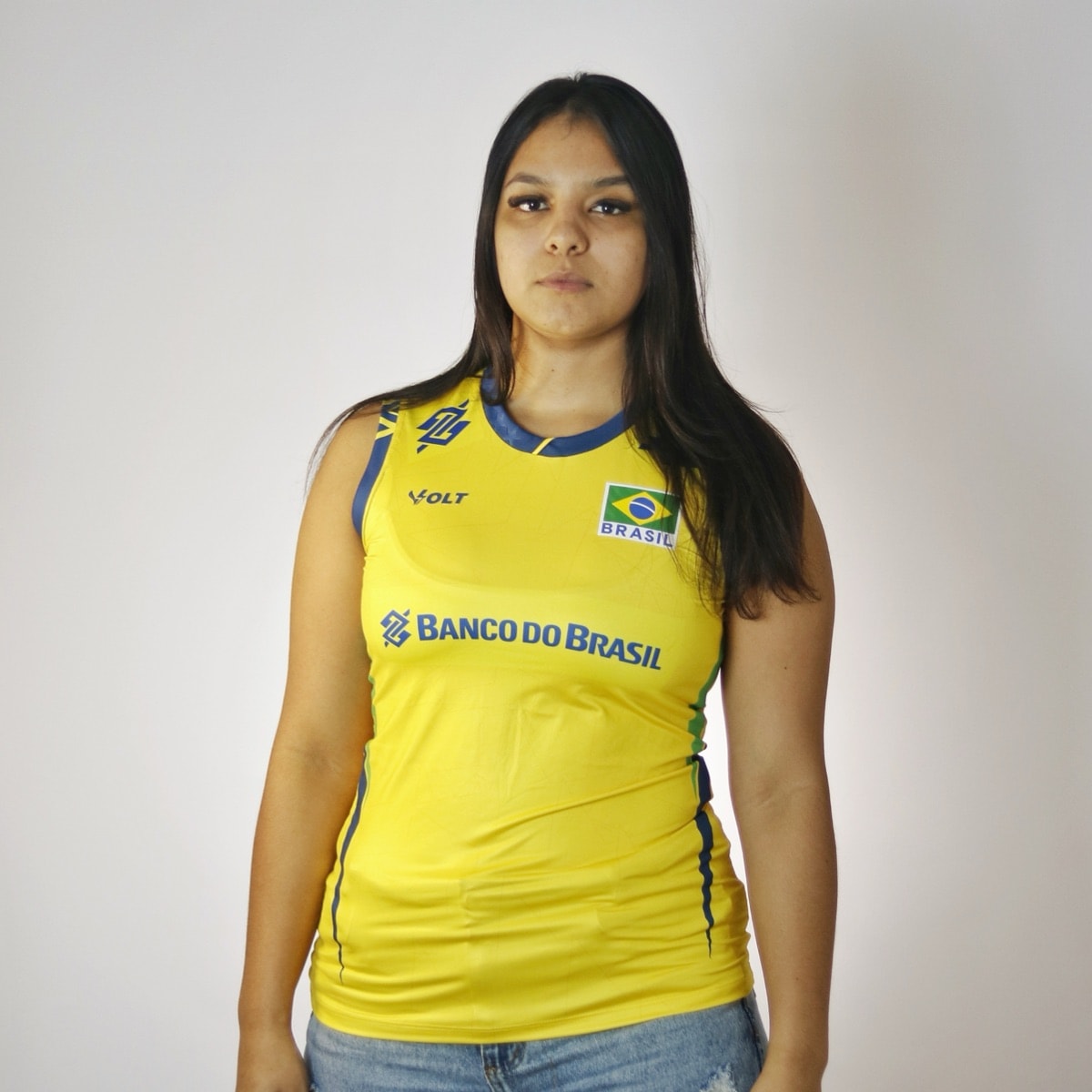 A Camisa Regata Brasil Vôlei Feminino Jogo 1 é a expressão máxima de orgulho e performance. Em tom vibrante de amarelo, ela estampa com destaque os patrocínios da seleção e traz o escudo do Brasil em patch emborrachado no peito, ao lado do símbolo da Volt, reforçando sua autenticidade.