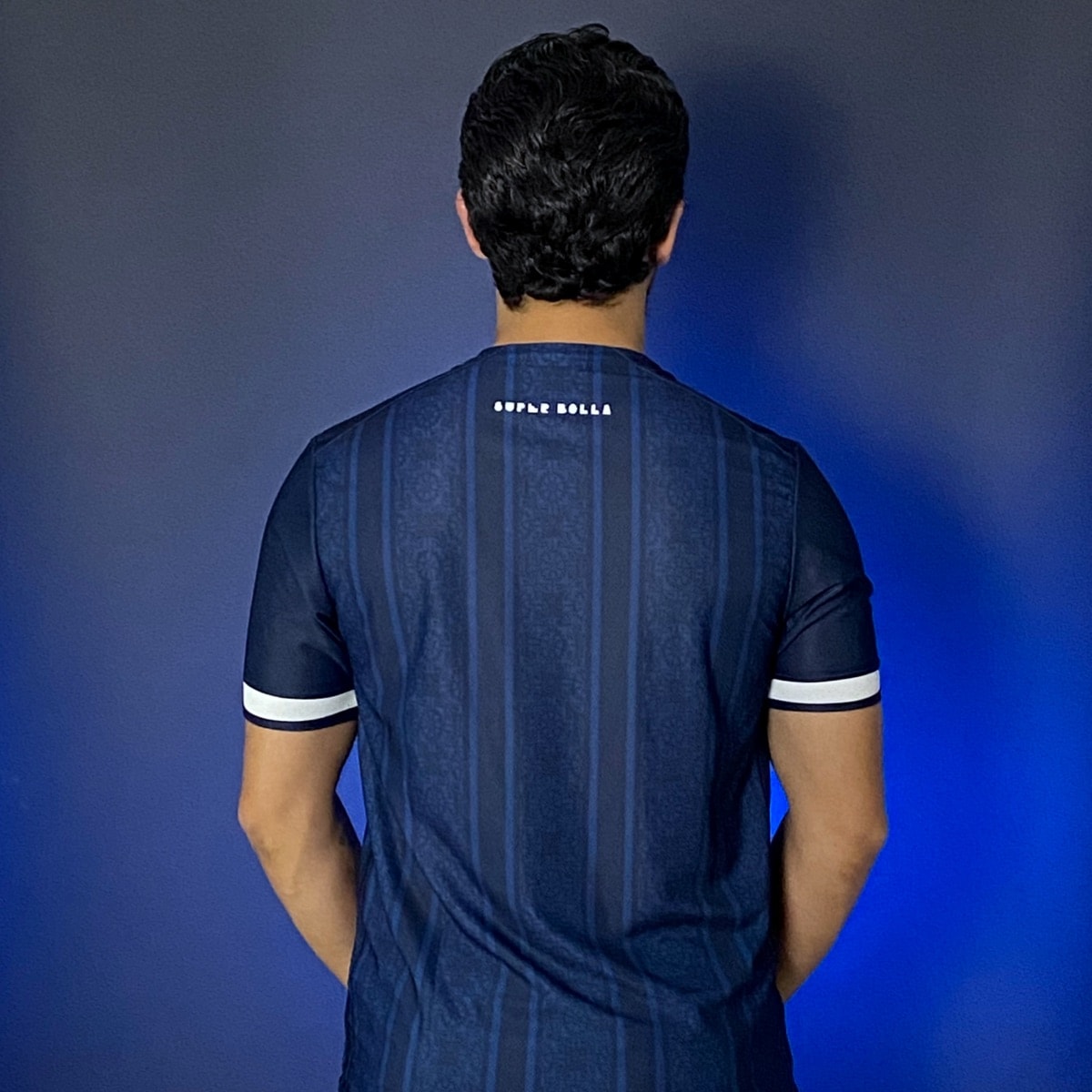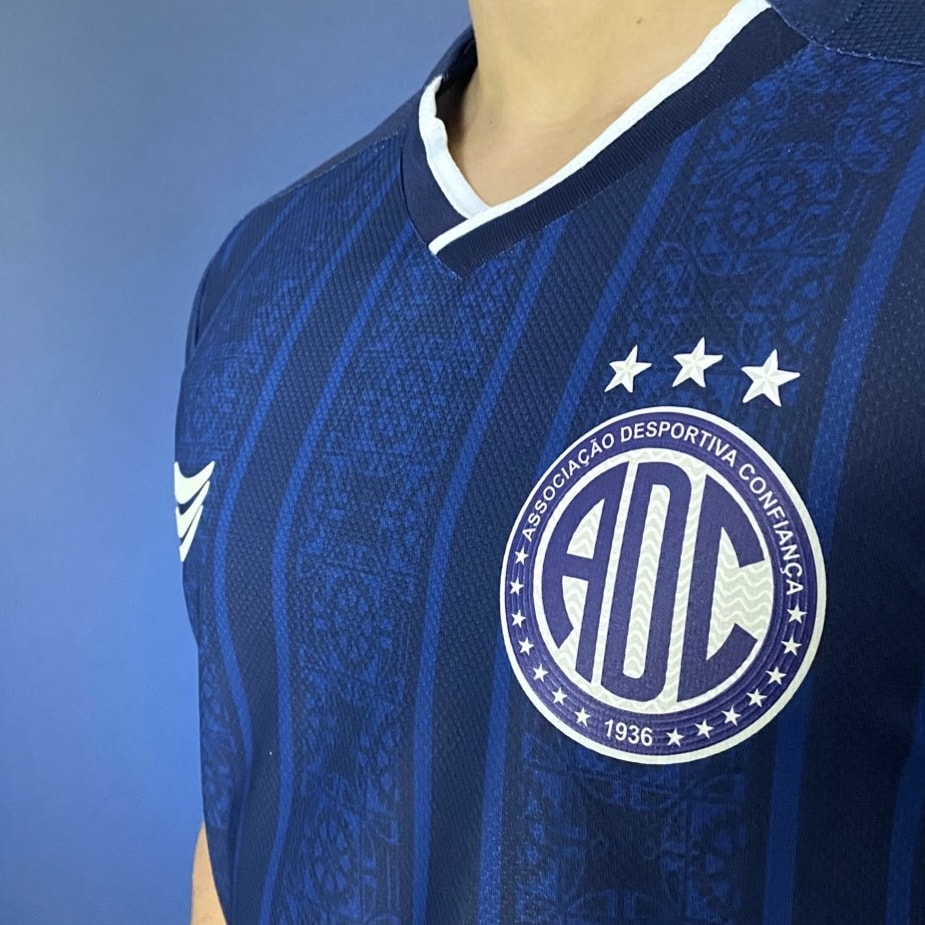 A terceira camisa do Confiança para 2025 exibe o azul profundo como protagonista, refletindo a identidade do clube com elegância e personalidade. Com gola V e detalhes em branco, o modelo combina um visual clássico com modernidade discreta.