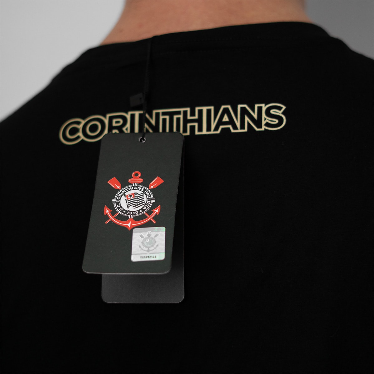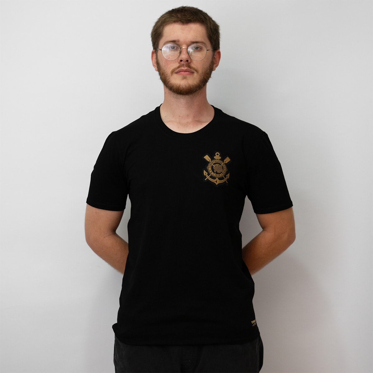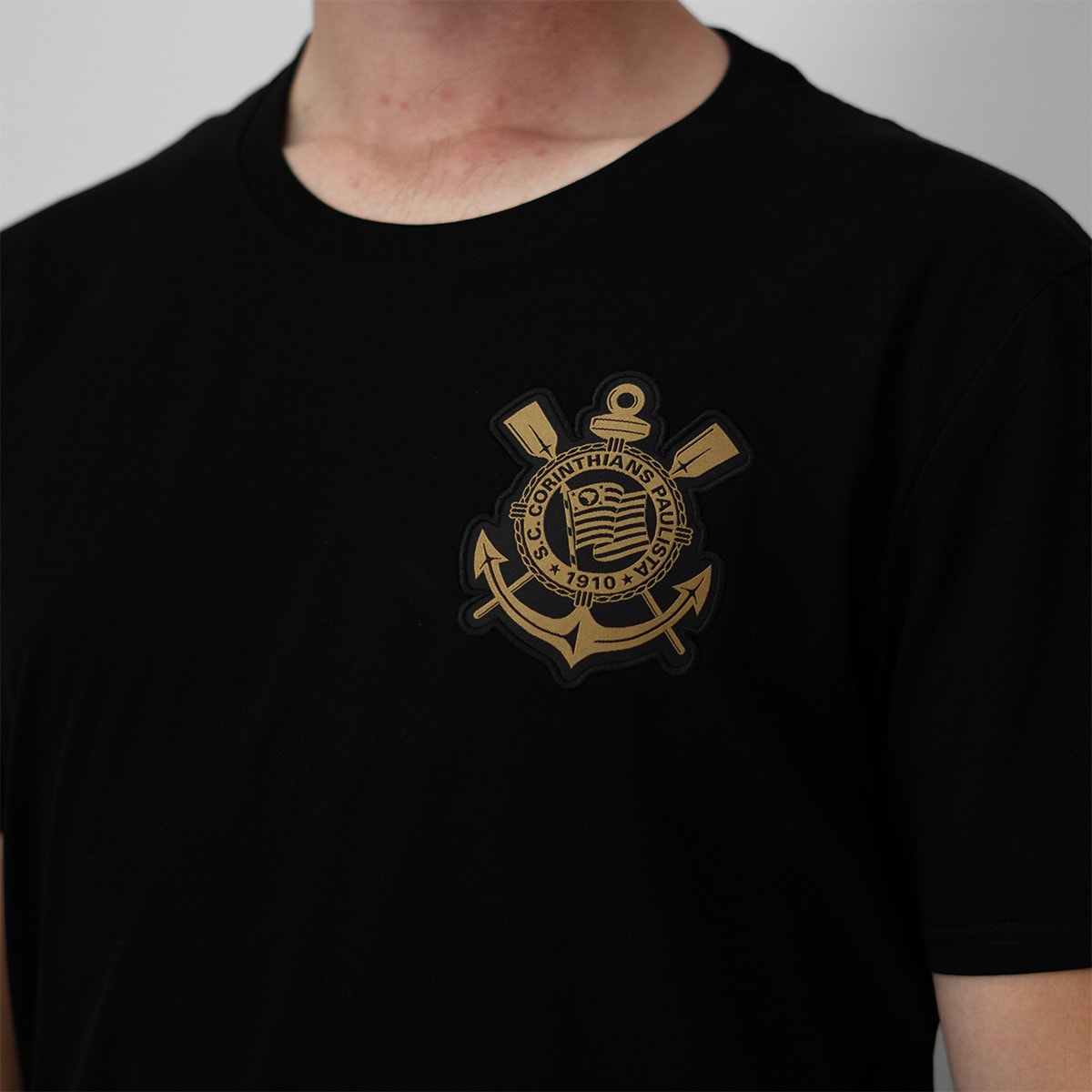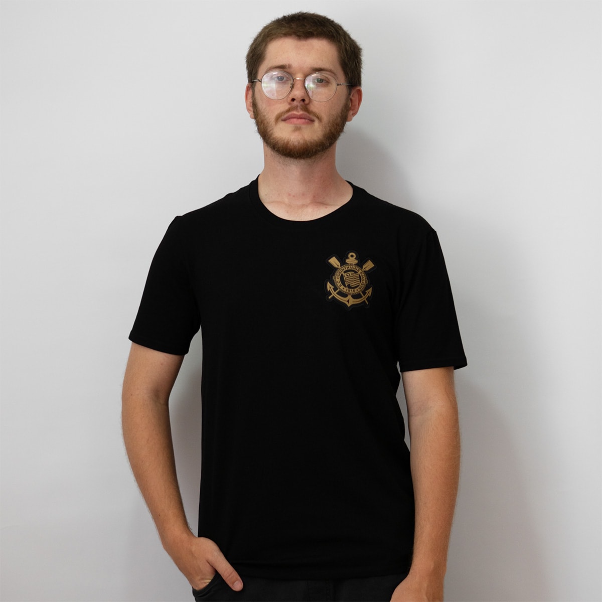 O design all black traz sofisticação, enquanto o escudo bordado em dourado adiciona um detalhe exclusivo e elegante. A gola redonda clássica completa o visual, tornando esta camisa básica uma escolha perfeita tanto para dias de jogo quanto para vibrar em casa com a Fiel.