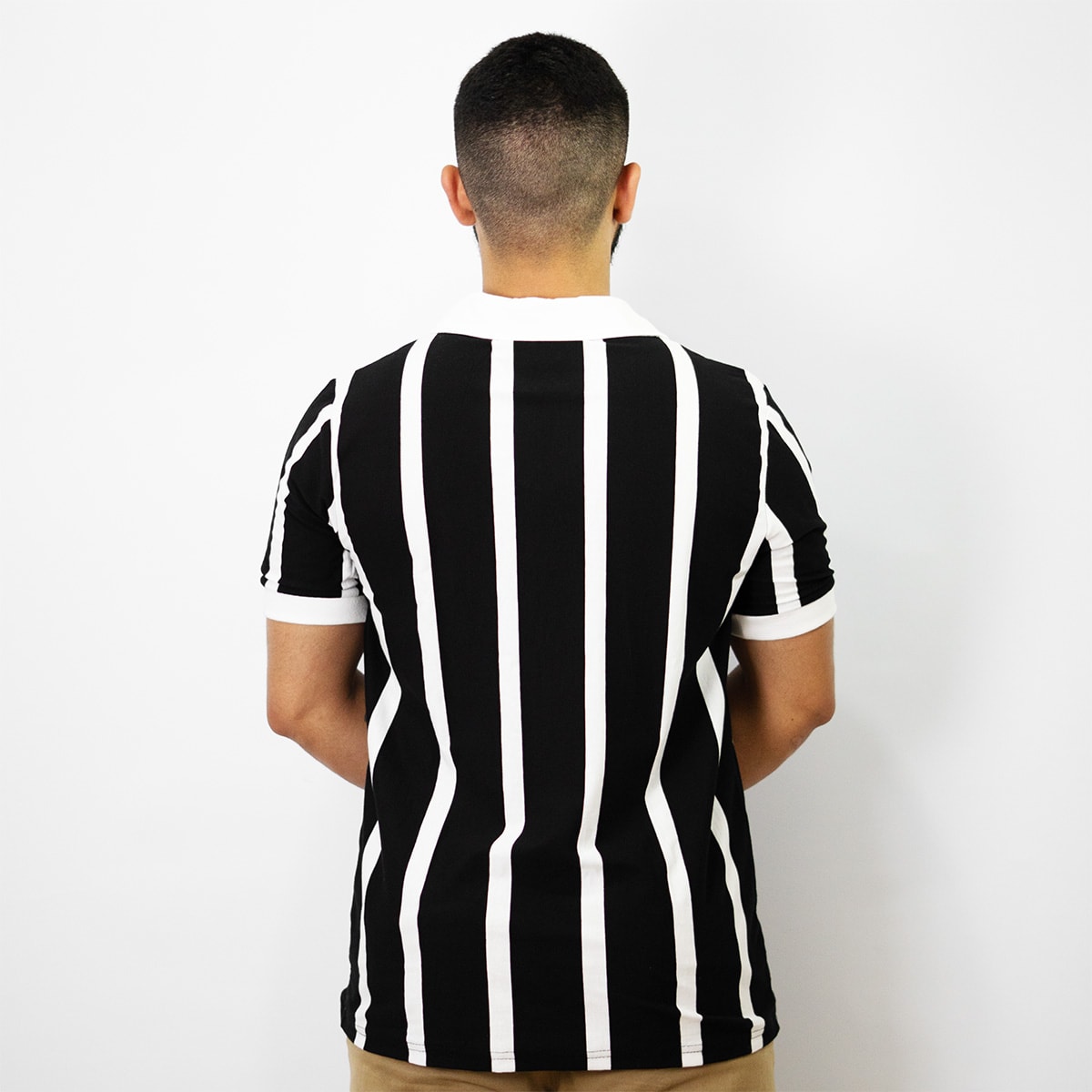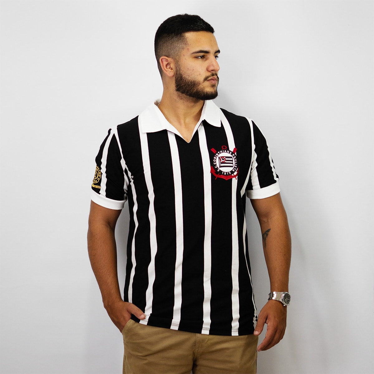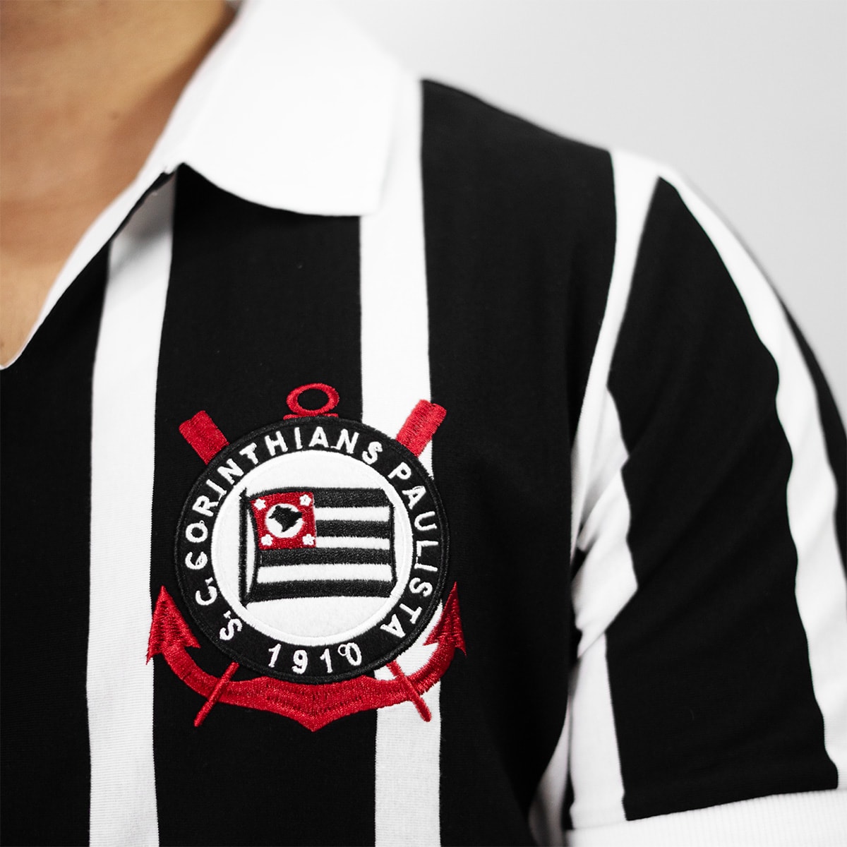 Com suas clássicas cores em preto com listras brancas, ela resgata o estilo marcante das antigas gerações. O escudo bordado no peito reforça o orgulho corinthiano, enquanto a gola polo e as mangas curtas trazem elegância e autenticidade à peça.