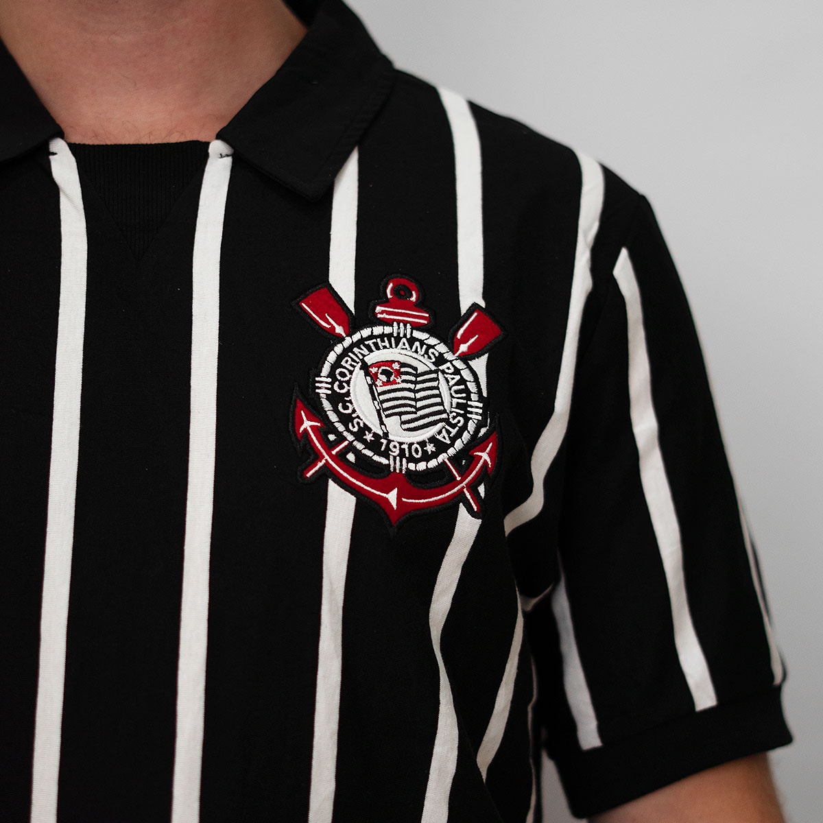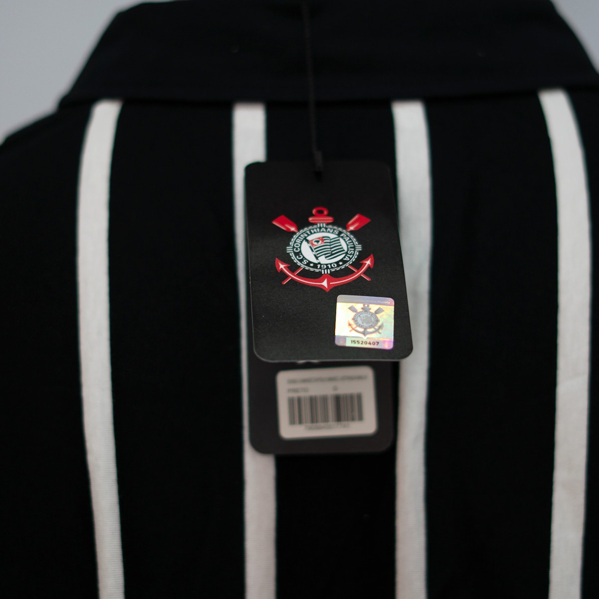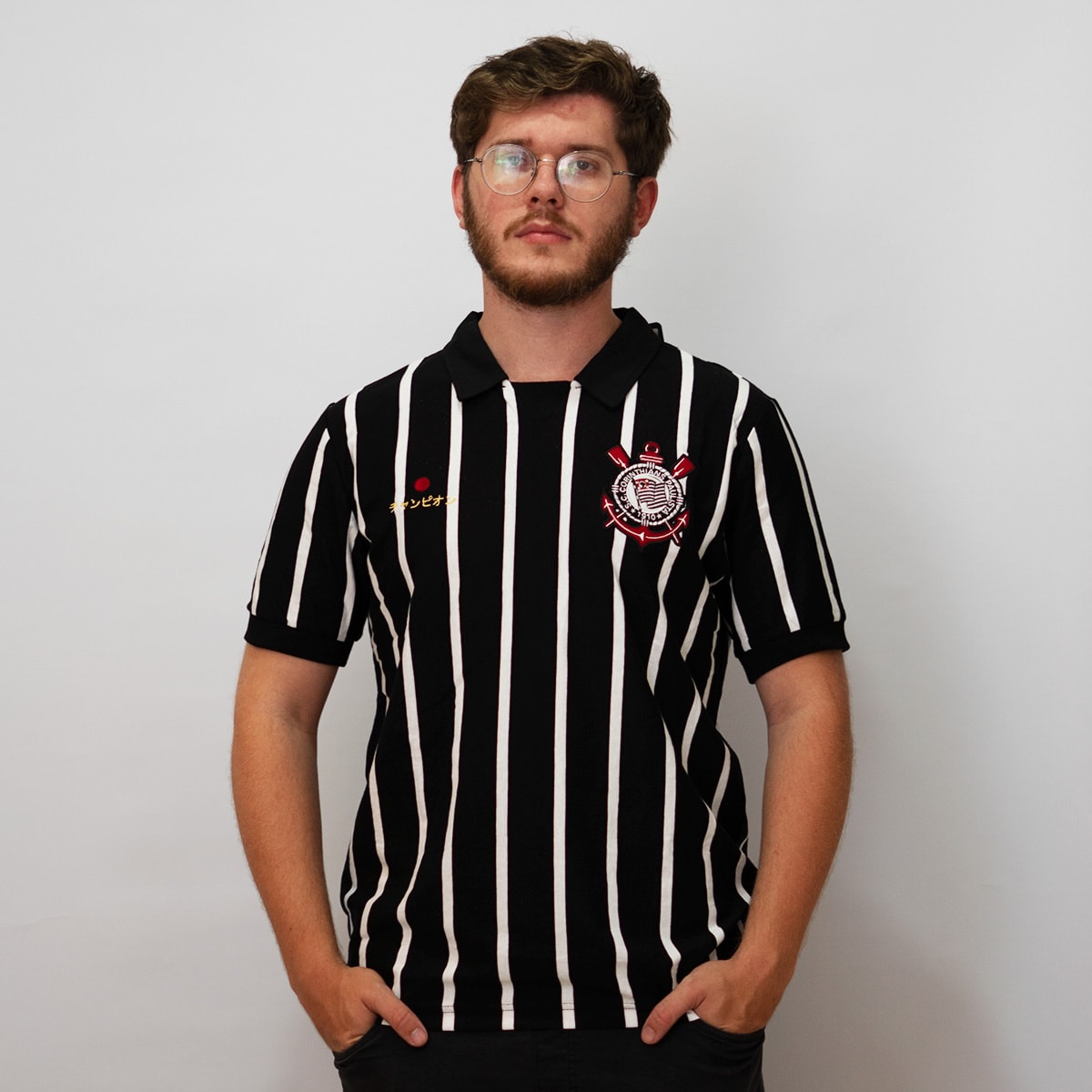 Celebre a história gloriosa do Timão com esta camisa polo exclusiva, que une tradição, elegância e memória de conquistas internacionais. Em preto clássico com listras brancas verticais, o design remete ao estilo atemporal do clube, ideal para torcedores que valorizam sofisticação e paixão.