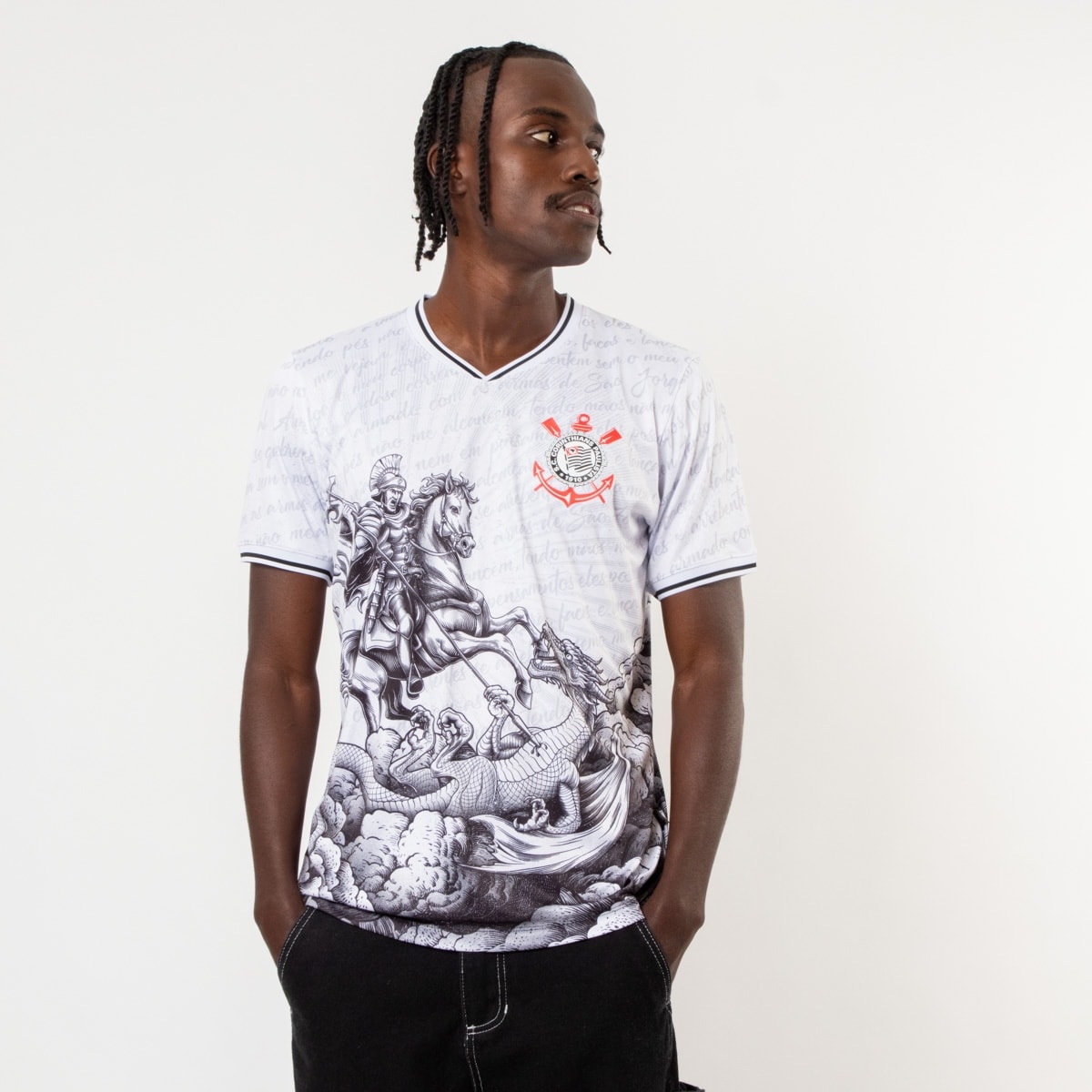 Com estampa marcante de São Jorge com a lança em mãos, vencendo o dragão, esta camisa transmite coragem e determinação. Ao fundo, escritas em destaque claro reforçam a identidade e a vibração das ruas.