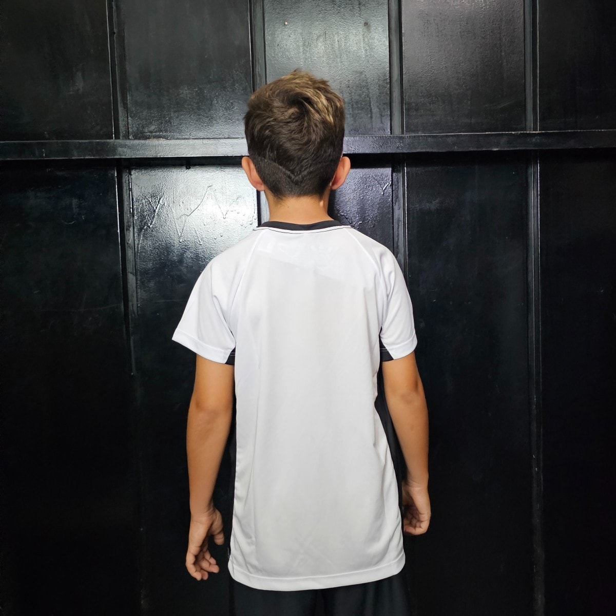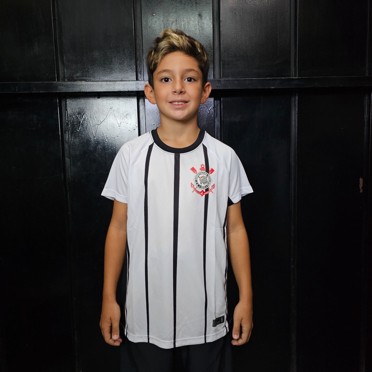A peça é a tradicional camisa do Corinthians na cor branca com as listras em preto, produzida em 100% poliéster leve e escudo estampado no peito.
