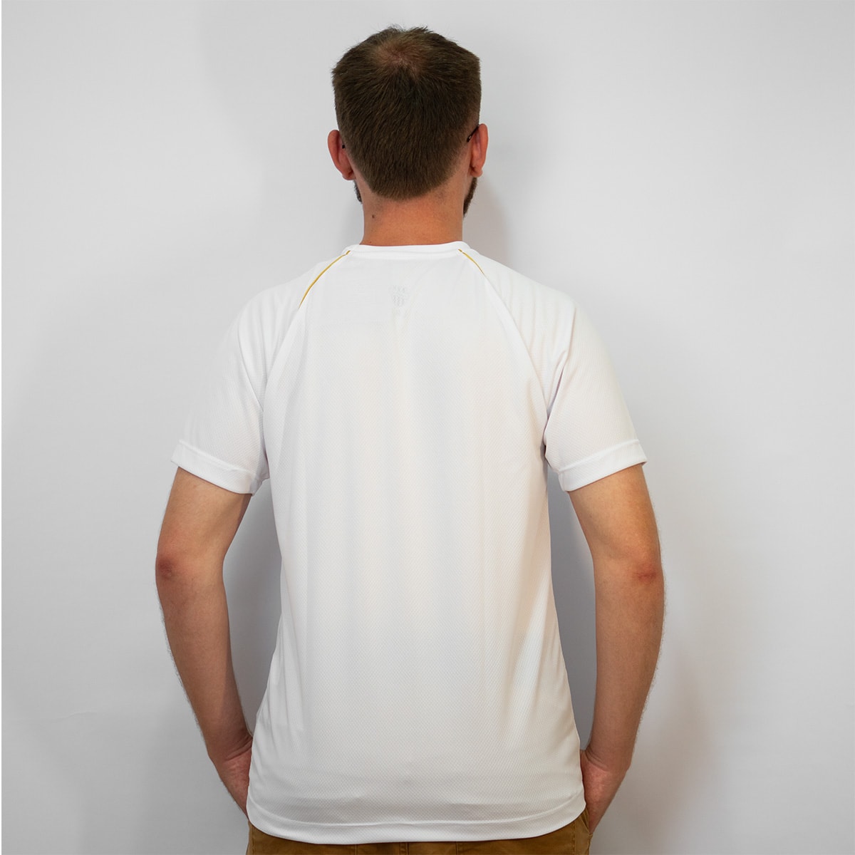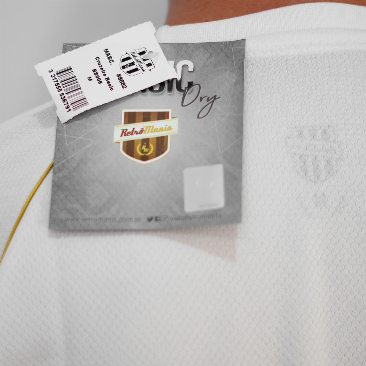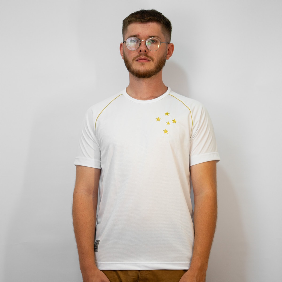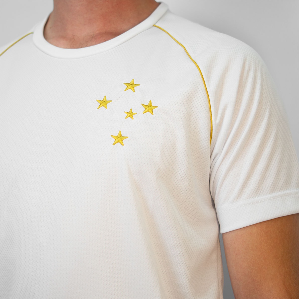 A camisa do Cruzeiro apresenta um design clean e elegante, com cor predominante em branco que transmite sofisticação e versatilidade.