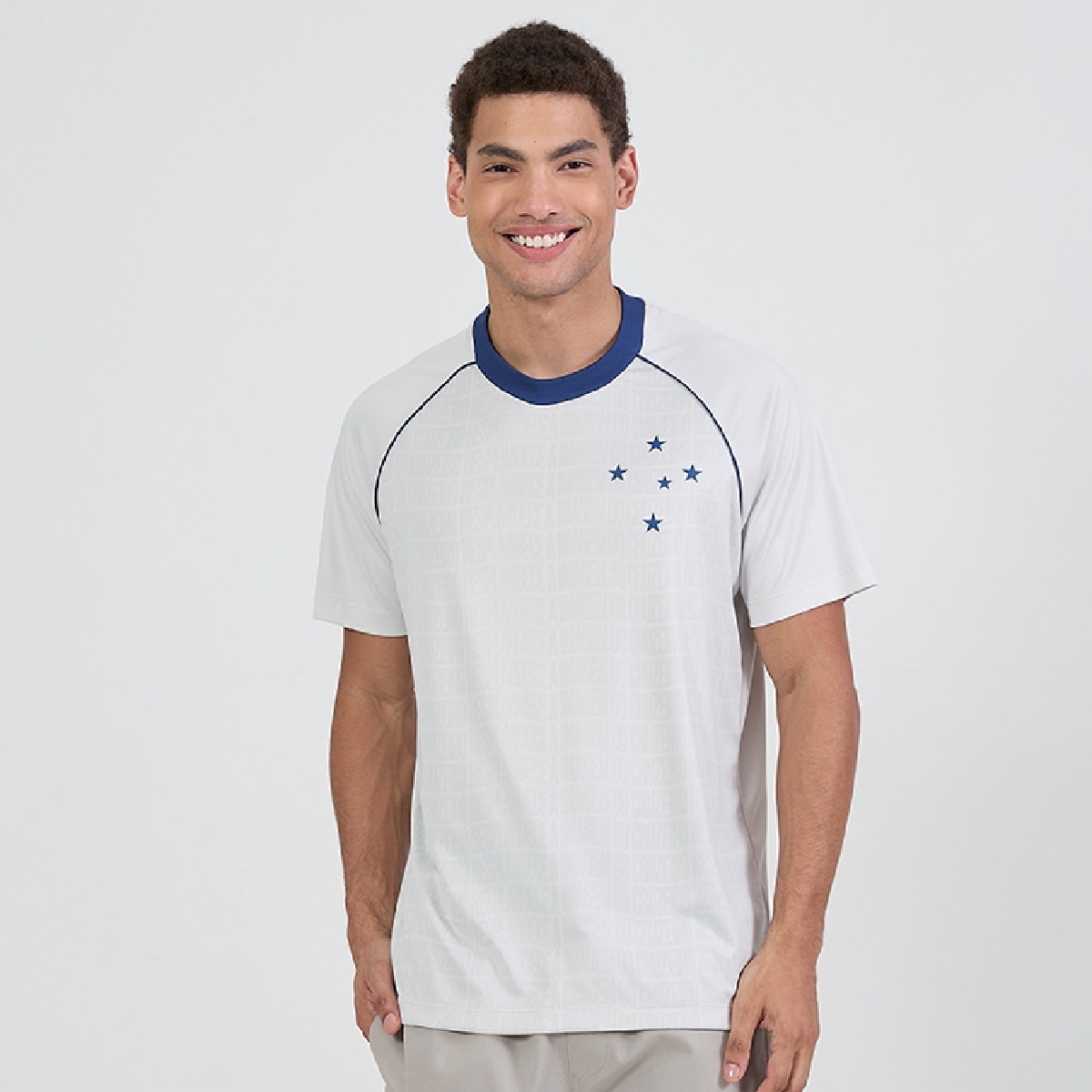 O design geométrico traz um toque contemporâneo, enquanto os detalhes em azul na gola e o escudo celeste estampado reforçam o orgulho e a tradição do Cruzeiro. Uma peça que traduz identidade, modernidade e amor pelo clube.