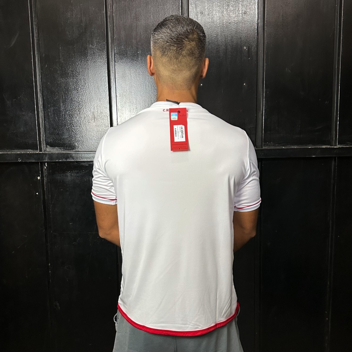 Produzida em 100% poliéster leve e respirável, a peça conta com um design ousado e moderno, na cor branca e com a faixa rubro negra na parte central, além do escudo do Mengão do lado esquerdo do peito.