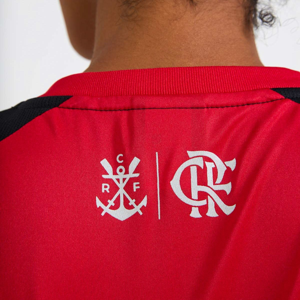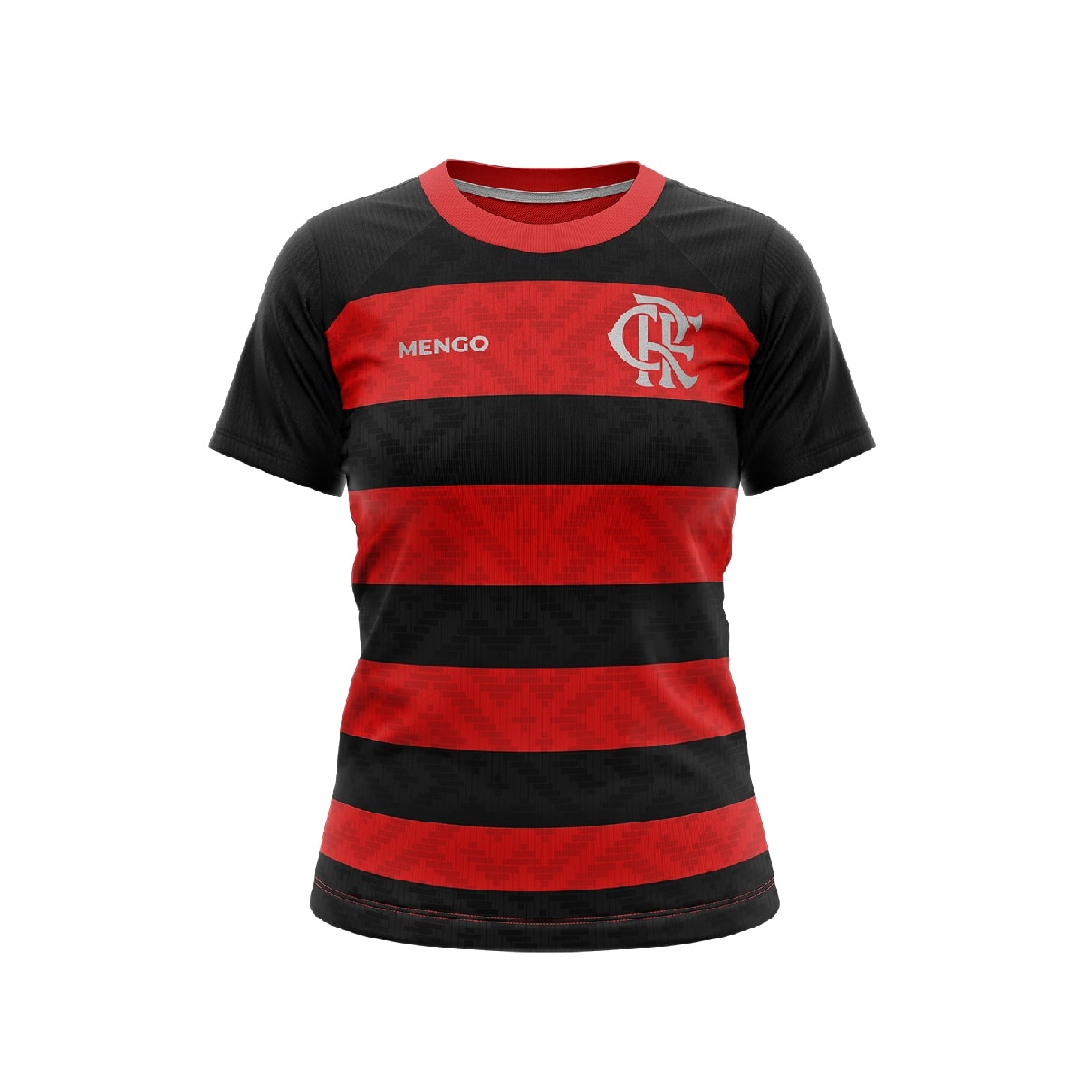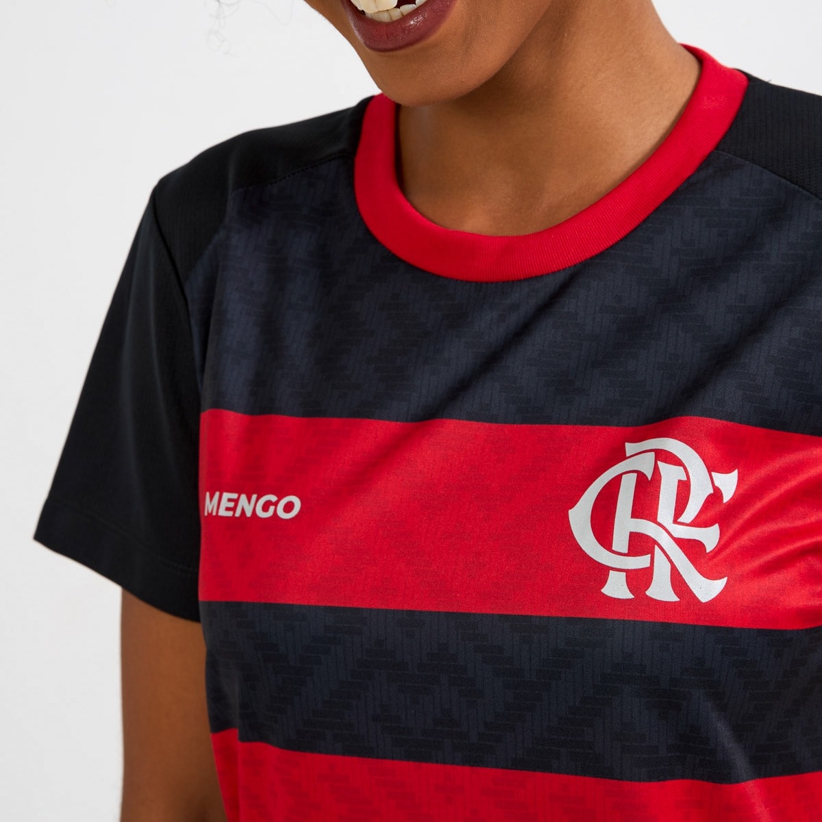 Produzida em 100% poliéster leve e respirável, a peça conta com um design ousado e moderno, listrada nas cores vermelho e preto, além do escudo do lado esquerdo do peito e a escrita "mengo" do lado direito.