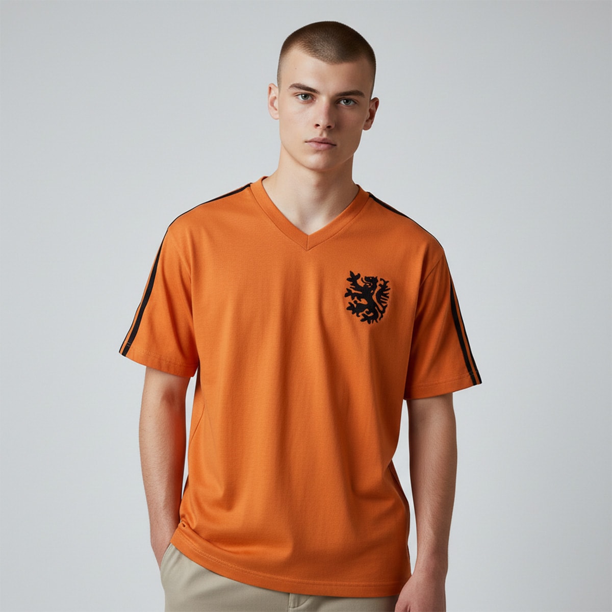 Predominantemente laranja — cor tradicional e marcante da seleção holandesa — o uniforme traz o número 14 eternizado por Cruyff, símbolo de genialidade e inovação dentro de campo. O escudo bordado reforça a autenticidade e o orgulho, enquanto o tecido em algodão proporciona conforto e qualidade, tornando-o ideal tanto para colecionadores quanto para apaixonados por futebol.
