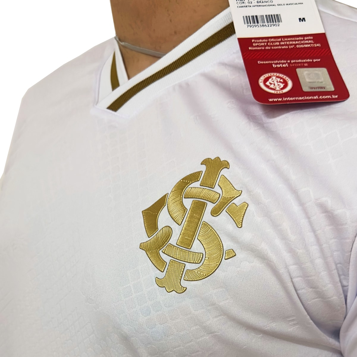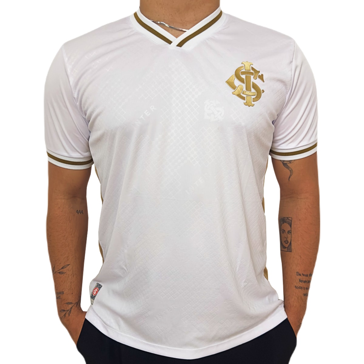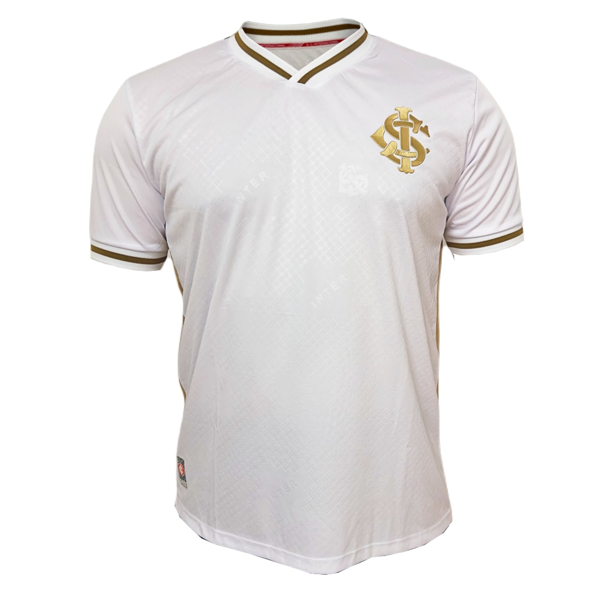 Camisa em homenagem ao Internacional e aos seus torcedores apaixonados. Em gola V, manto produzido em 100% poliéster extremamente leve e confortável, na cor branca, com detalhes em dourado, conta com escudo do Colorado em patch emborrachado no peito.