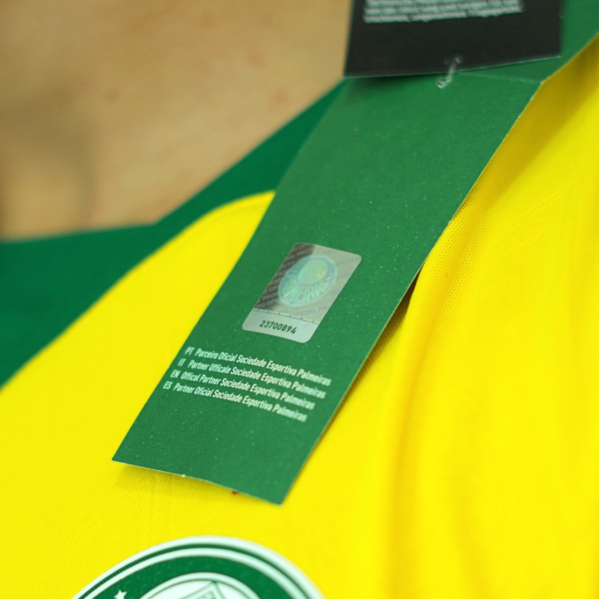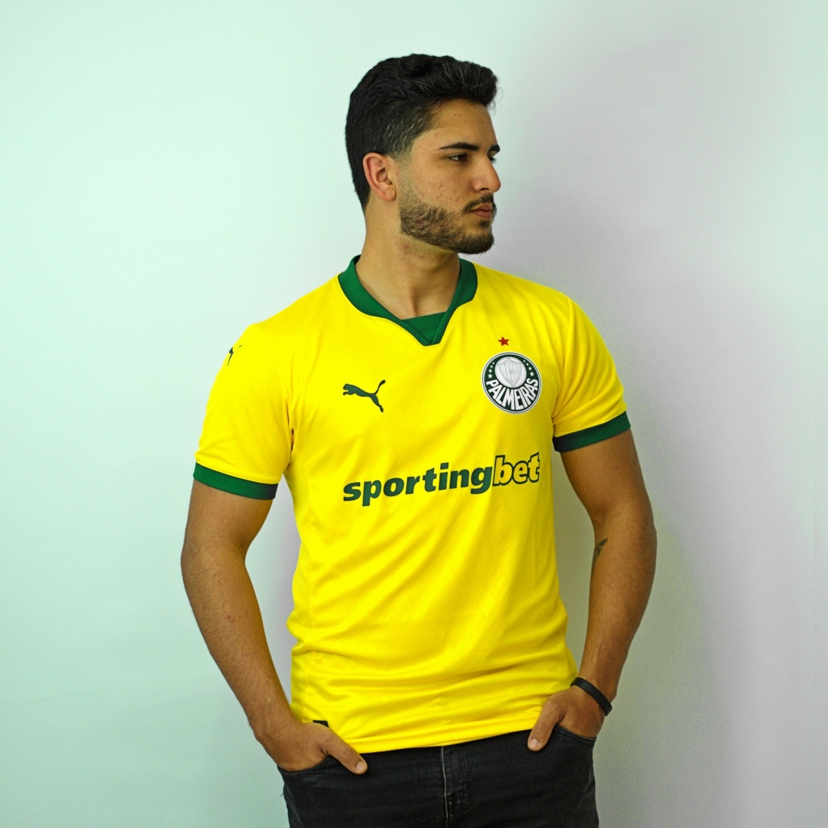 O uniforme THIRD é inspirado na escalação 100% alviverde da Primeira Academia. O sign off “Palmeiras, Meu Palmeiras” na gola convida o torcedor a vestir não apenas um uniforme, mas uma bandeira, um grito que ecoa nas arquibancadas. A camisa é amarelo vibrante com detalhes em verde, acompanhada de short azul e meiões brancos com faixas verdes e amarelas. Entre os elementos visuais estão o embossing frontal com “Maior Campeão do Brasil”, o “P” em louros e a nova gola em V com recorte moderno, exclusivo da PUMA, e o tecido com brilho sutil que entrega estética elegante e imponente.