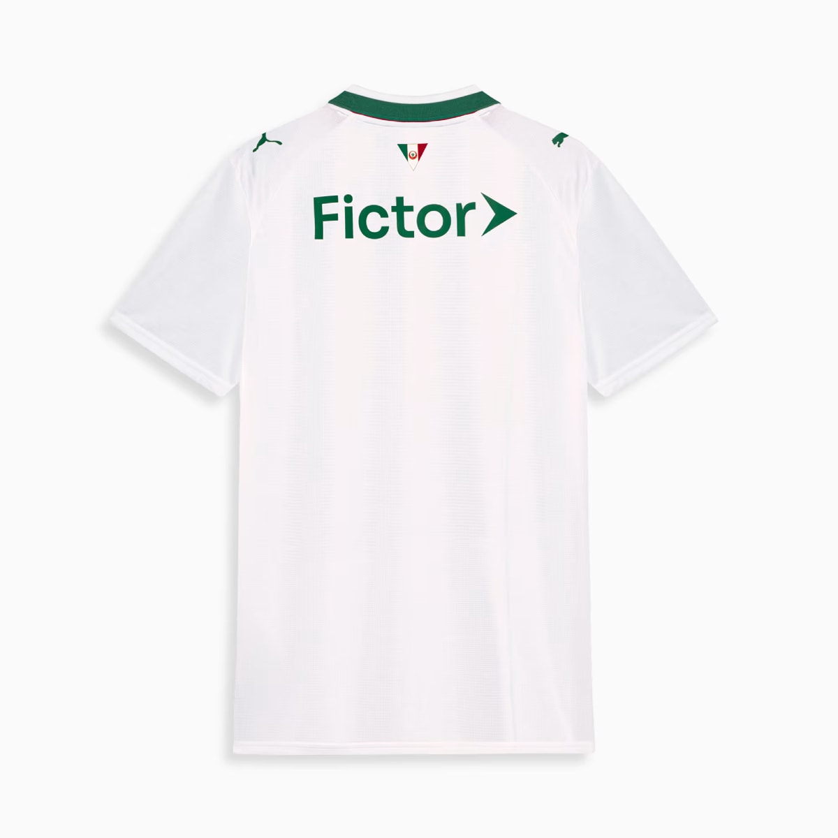 O modelo apresenta corte regular fit, gola polo elegante, mangas curtas e arte sublimada na parte frontal. O logo Puma bordado aparece no lado direito do peito, enquanto o escudo oficial do Palmeiras bordado ocupa o lado esquerdo, acompanhados de patrocínio aplicado na frente e assinatura especial nas costas. O tecido Mesh proporciona respirabilidade e leveza, com acabamento que inclui o logo PUMA nos ombros para reforçar a autenticidade.