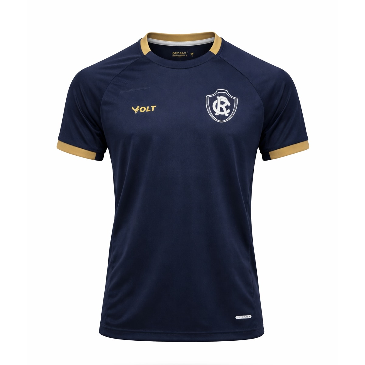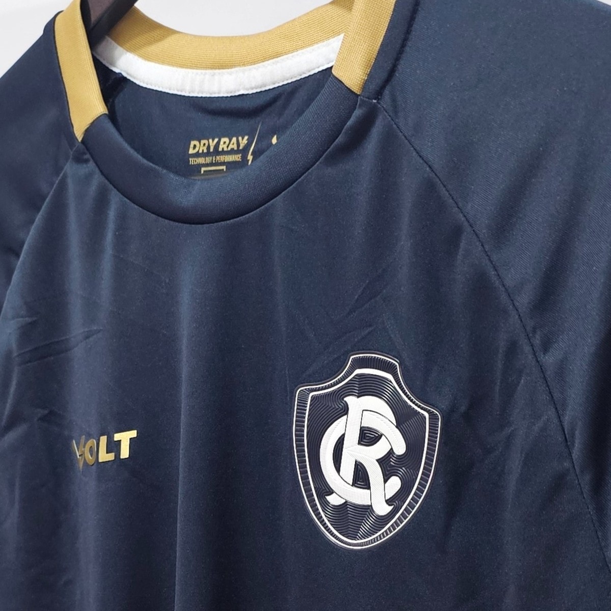 Camisa oficial do Clube do Remo, com design moderno e elegante. O modelo apresenta predominância da cor azul-marinho, com detalhes em dourado na gola e nas mangas, trazendo um visual sofisticado e esportivo ao mesmo tempo. O escudo do Remo aparece aplicado em patch no lado esquerdo do peito, em destaque, enquanto o logo da Volt está posicionado no lado direito, ambos em cor clara, criando ótimo contraste com o fundo da camisa.