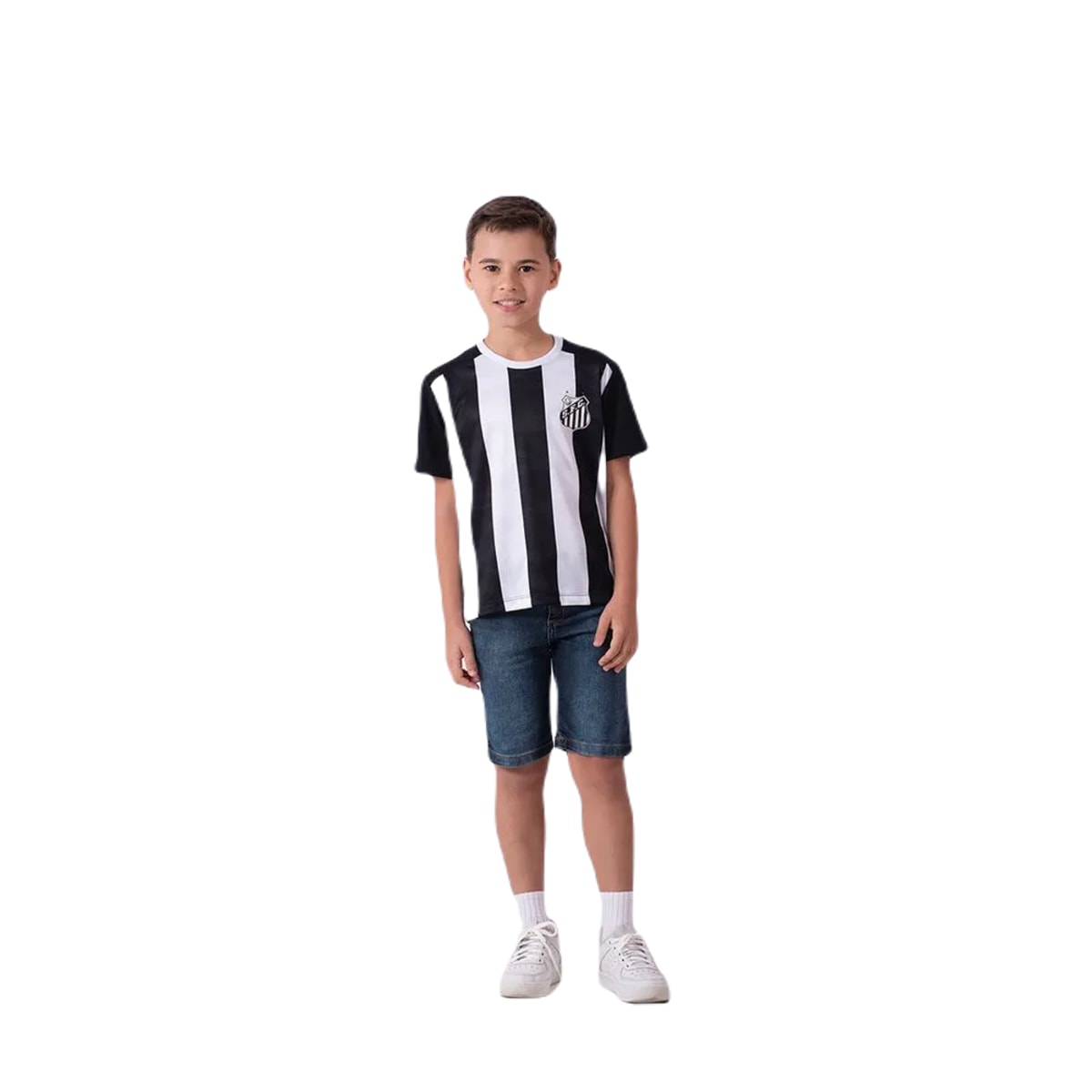 A camisa do Santos, modelo Matriz, é uma excelente escolha para os jovens torcedores do Peixe demonstrarem sua paixão pelo clube. Produzida em poliéster, ela combina conforto e durabilidade, apresentando um design elegante nas cores branca e preta. O destaque fica por conta do escudo do Santos, estampado com grande visibilidade, simbolizando o orgulho de vestir o manto alvinegro em qualquer ocasião.