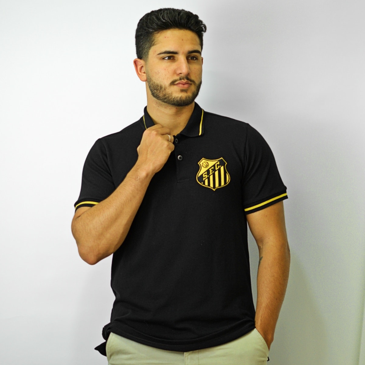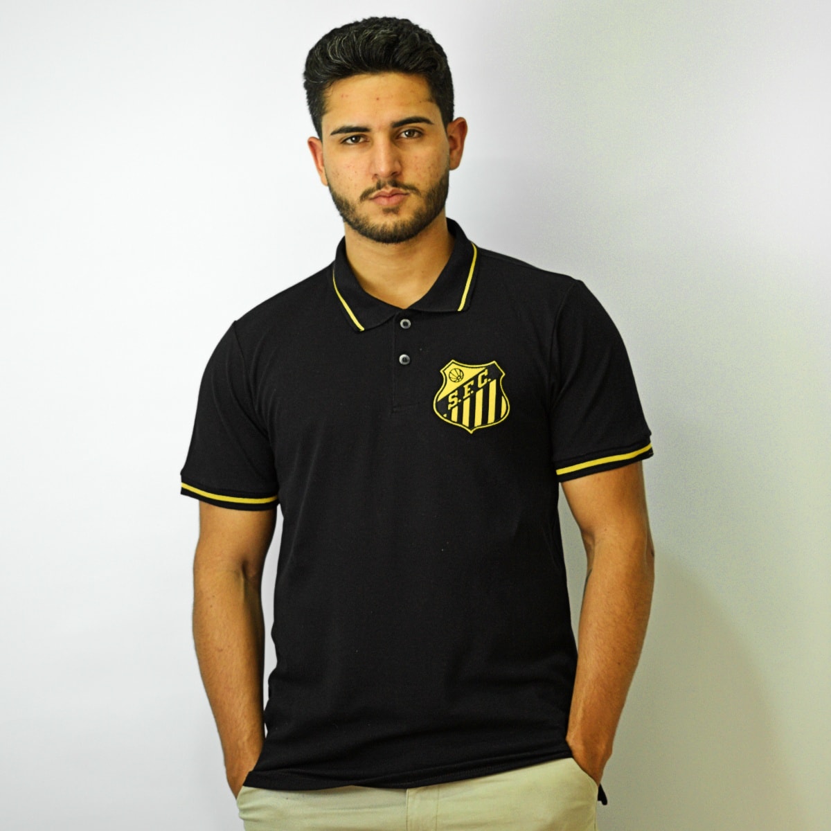 O design elegante traz a cor preta como protagonista, com detalhes em dourado que destacam o estilo esportivo e sofisticado. A gola polo clássica reforça a versatilidade da peça, enquanto o escudo do Peixe bordado no peito simboliza a tradição e a garra santista. Um verdadeiro manto para quem carrega o Santos no coração.