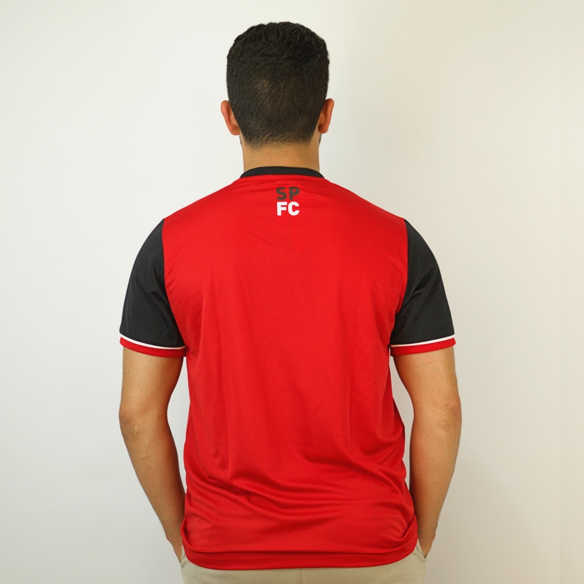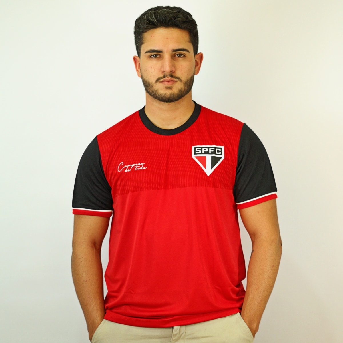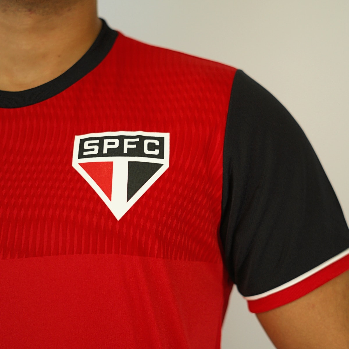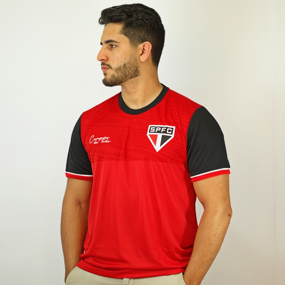 Camisa São Paulo esportiva confeccionada em tecido poliéster, oferecendo leveza, conforto e excelente respirabilidade. Com design marcante em vermelho, mangas pretas e detalhes em branco nas extremidades, a peça combina estilo e tradição.