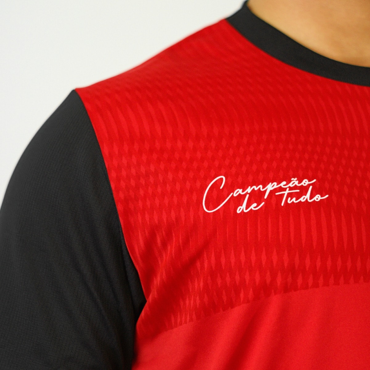 No lado direito do peito, o escudo estampado do São Paulo Futebol Clube (SPFC) reforça o orgulho tricolor, enquanto no lado esquerdo, a frase “Campeão de tudo” destaca a grandeza e as conquistas históricas do clube.