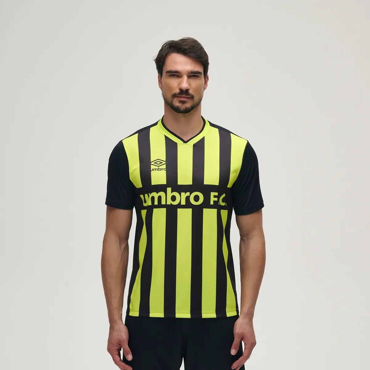 A estampa frontal sublimada com listras adiciona um toque moderno, complementada pelo logo da Umbro centralizado e outra aplicação na parte superior direita da peça. Ideal para quem busca desempenho e praticidade sem abrir mão do visual esportivo.