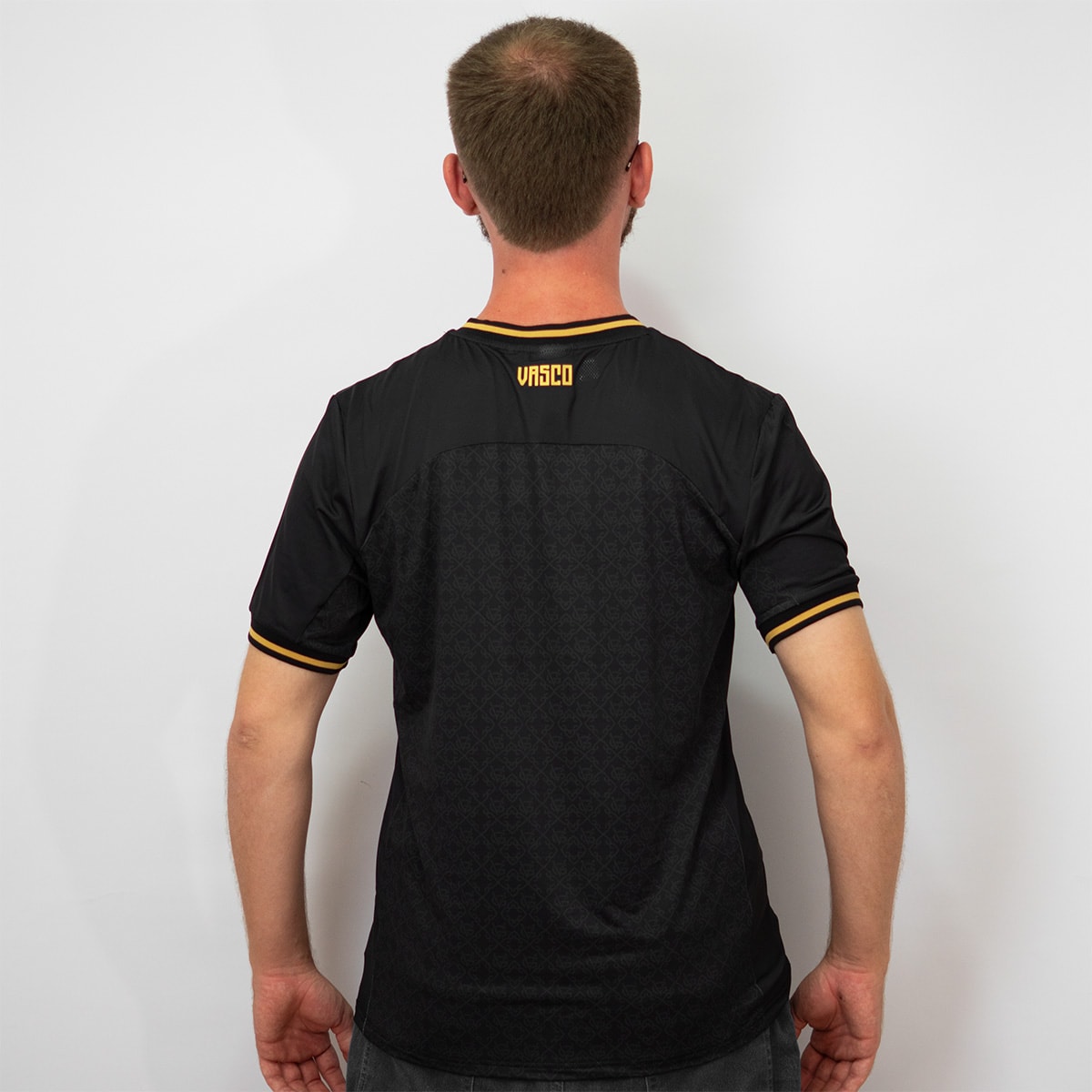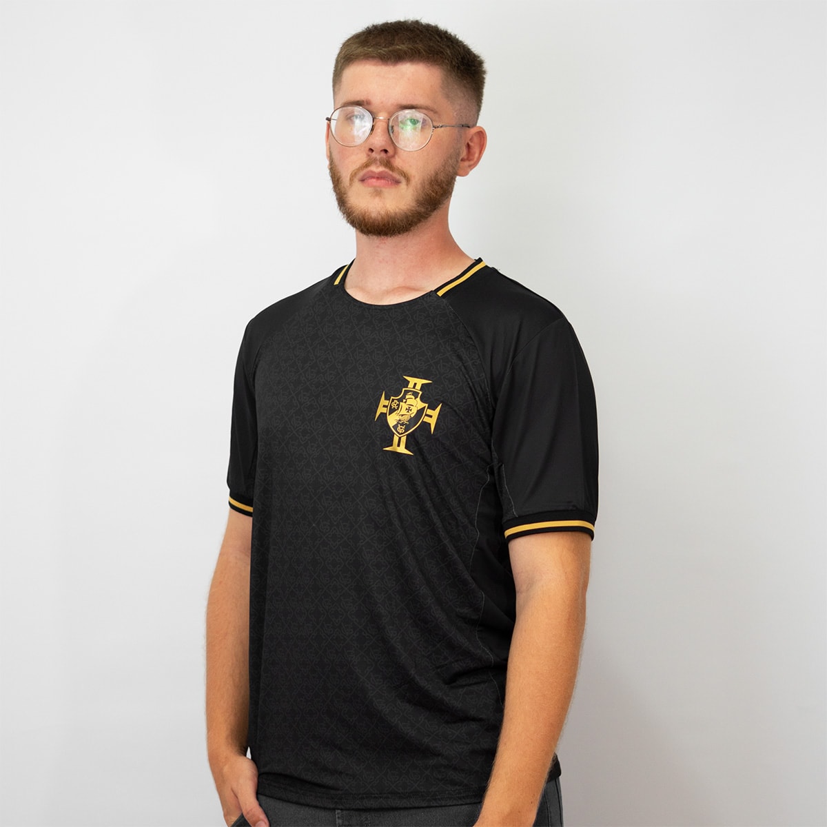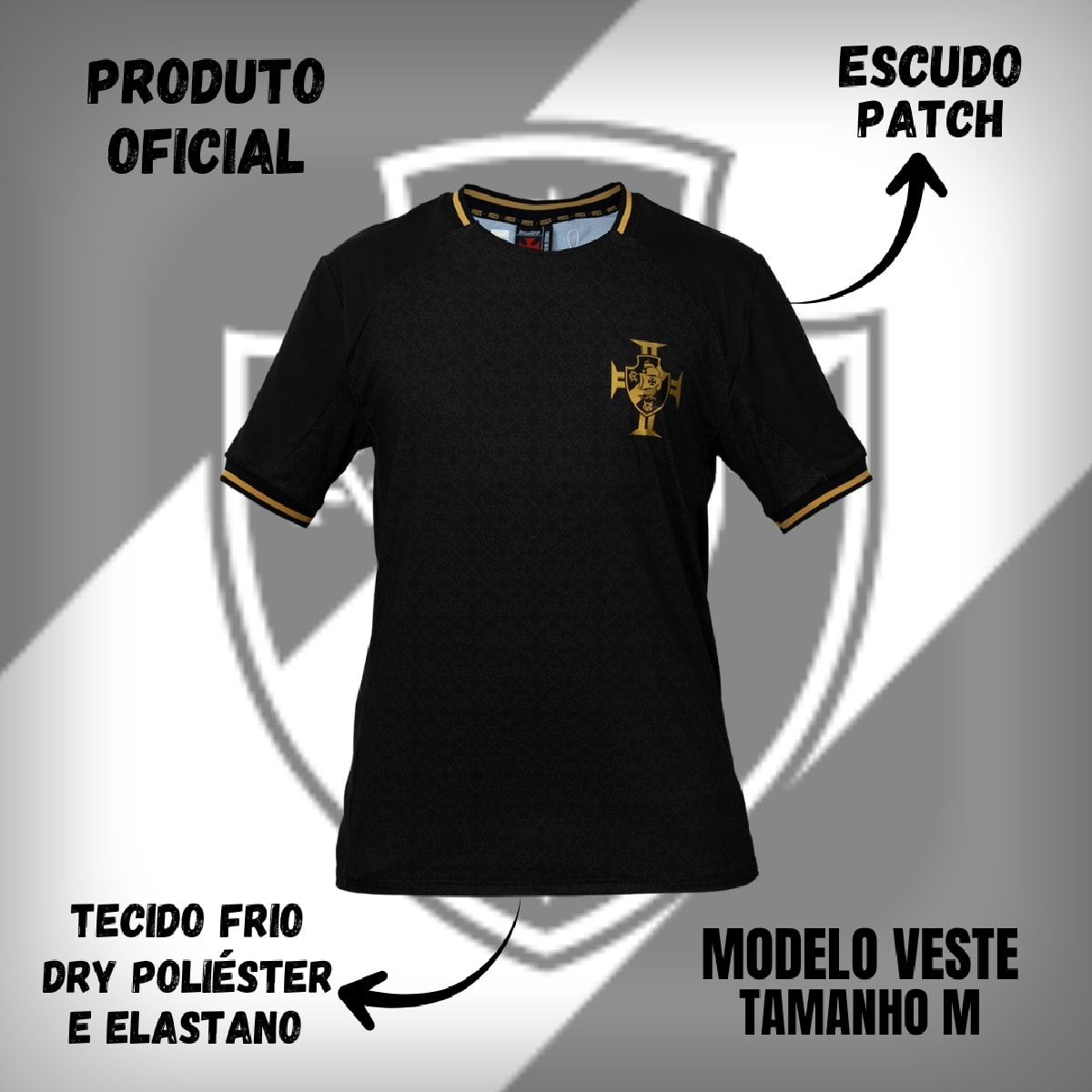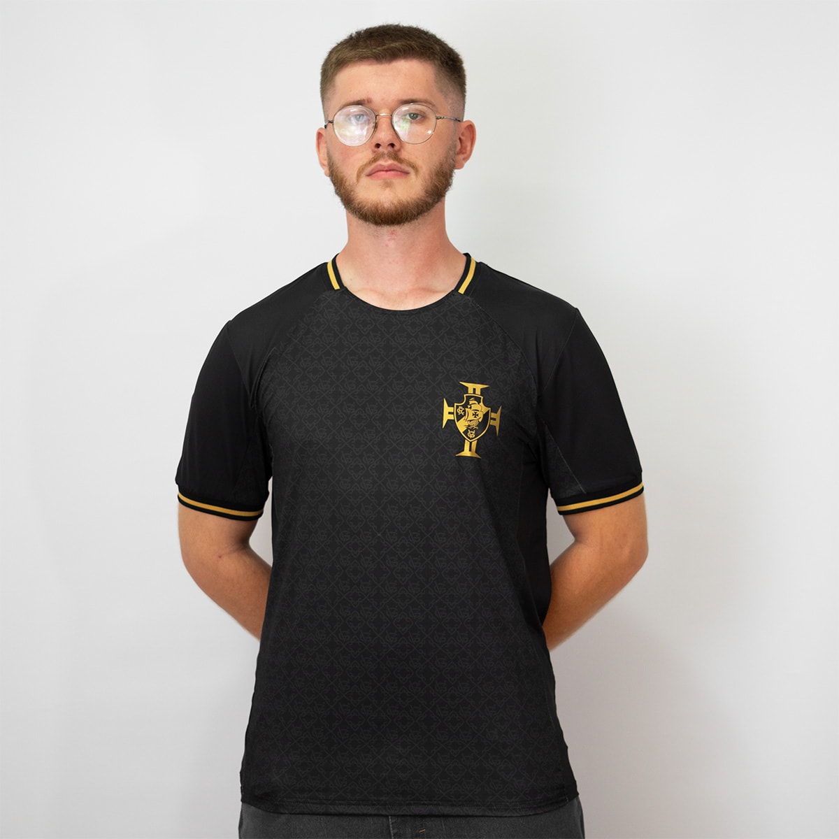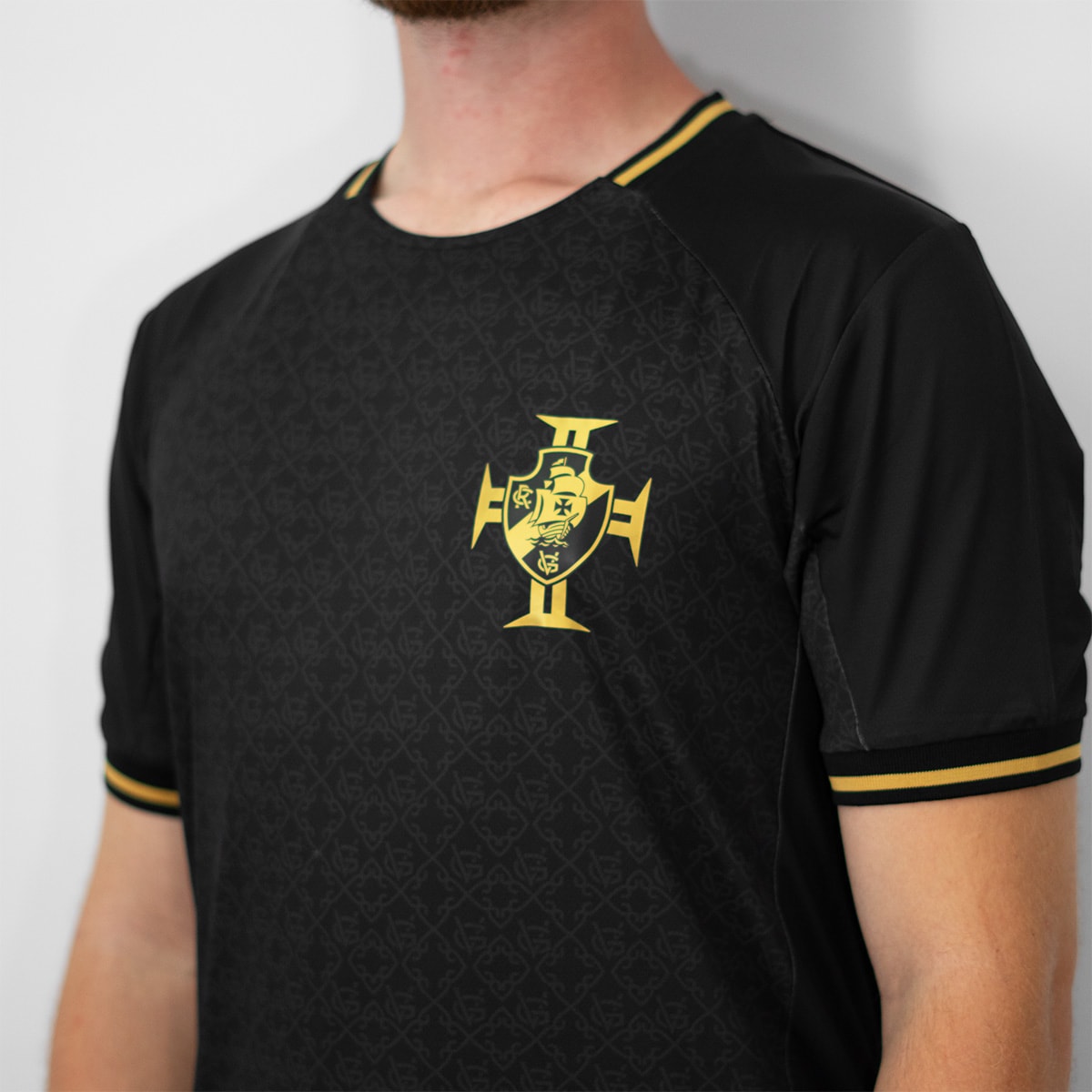 A camisa do Vasco da Gama na versão preto e dourado é a união perfeita entre estilo e tradição. Com predominância do preto, ganha sofisticação nos detalhes em dourado presentes na gola e nas mangas, transmitindo imponência e elegância.