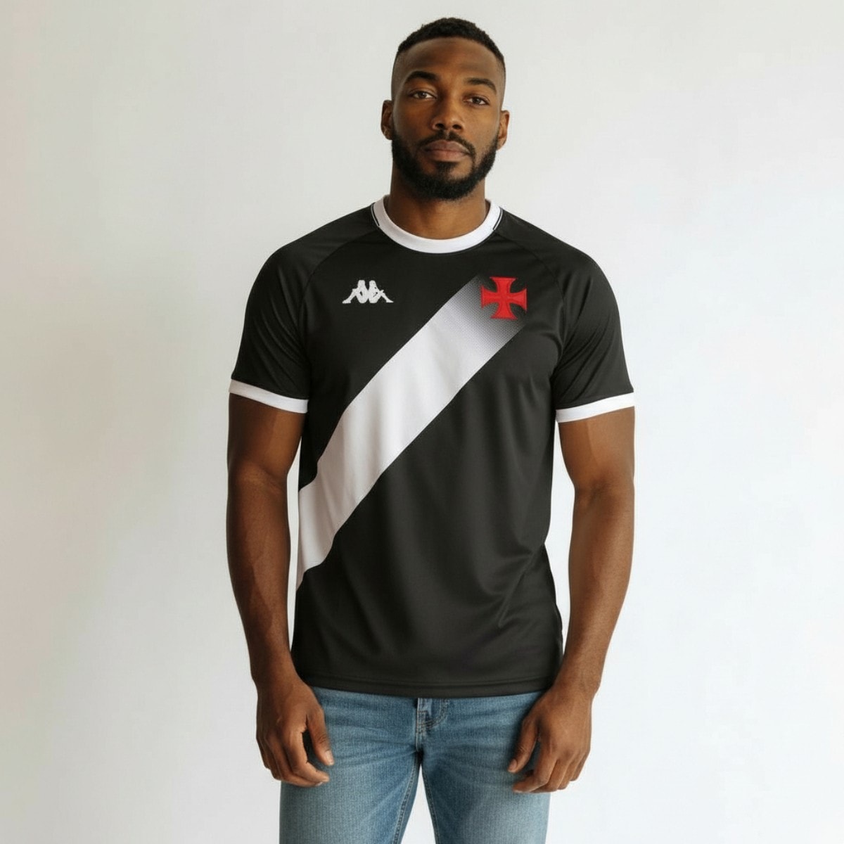 A camisa do Vasco da Gama, produzida pela Kappa, apresenta um design elegante e tradicional. Predominantemente preta, ela é marcada por uma faixa diagonal branca que atravessa o uniforme do lado inferior esquerdo ao ombro direito — um dos símbolos mais icônicos do clube.