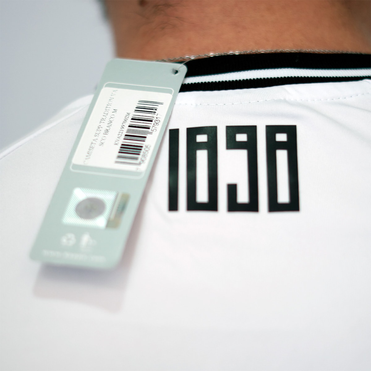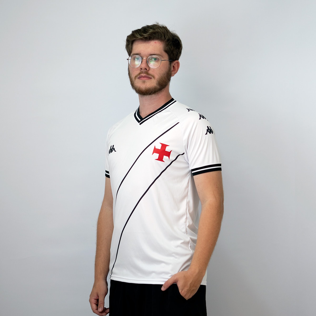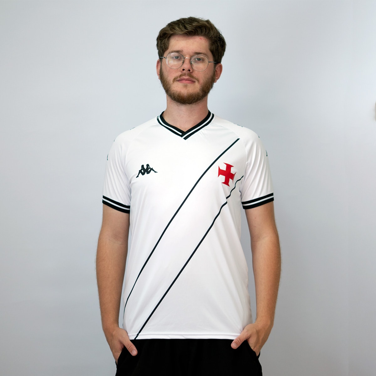 A camisa oficial do Vasco da Gama, produzida pela Kappa, combina tradição e estilo em um design marcante. Predominantemente branca, ela apresenta listras pretas na parte frontal que reforçam sua identidade visual.