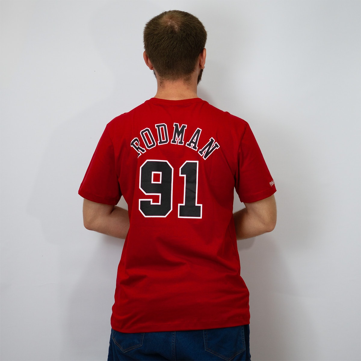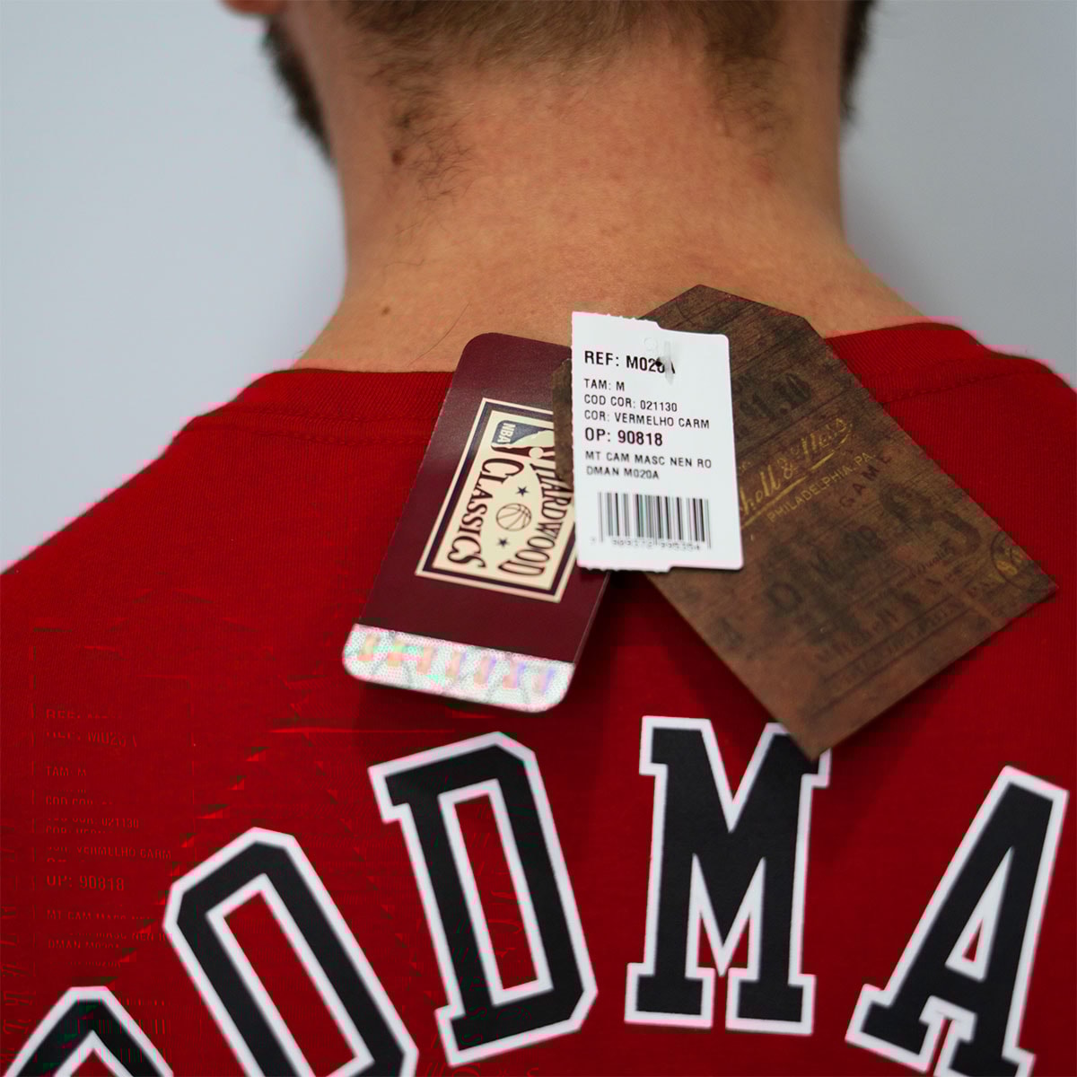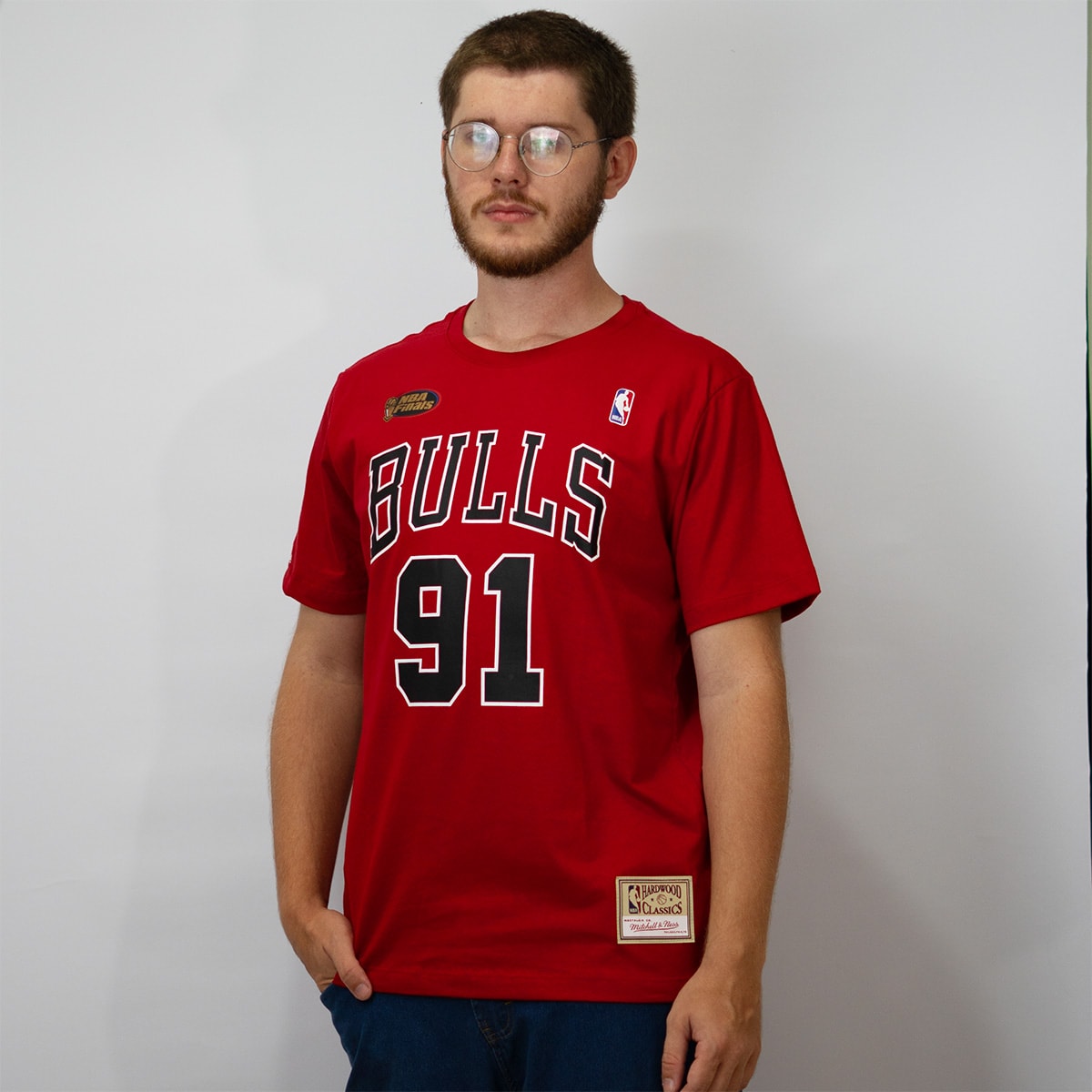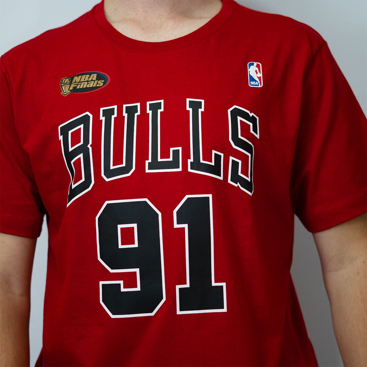A camisa é uma peça do Chicago Bulls, confeccionada na cor vermelha vibrante. Na parte frontal, exibe em destaque a palavra “BULLS”, acompanhada pelo número “91” logo abaixo — uma homenagem ao icônico jogador Dennis Rodman.