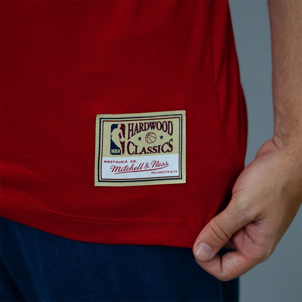 A peça traz detalhes especiais como o patch “NBA Finals” com gráfico de bola de basquete no lado superior esquerdo, o logotipo da NBA no lado superior direito, e o selo “Hardwood Classics” próximo à barra inferior, indicando que se trata de uma edição vintage da marca Mitchell & Ness.
