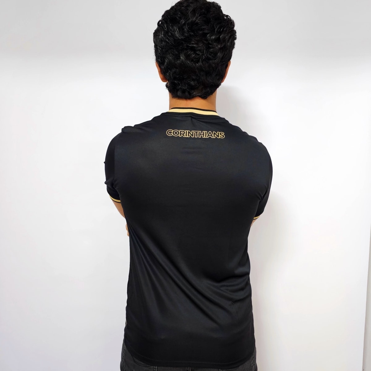 Camisa Símbolo Gold: elegante e imponente, apresenta o escudo bordado com acabamento refinado. Também em poliéster e com gola redonda, é perfeita para quem valoriza qualidade e estilo.