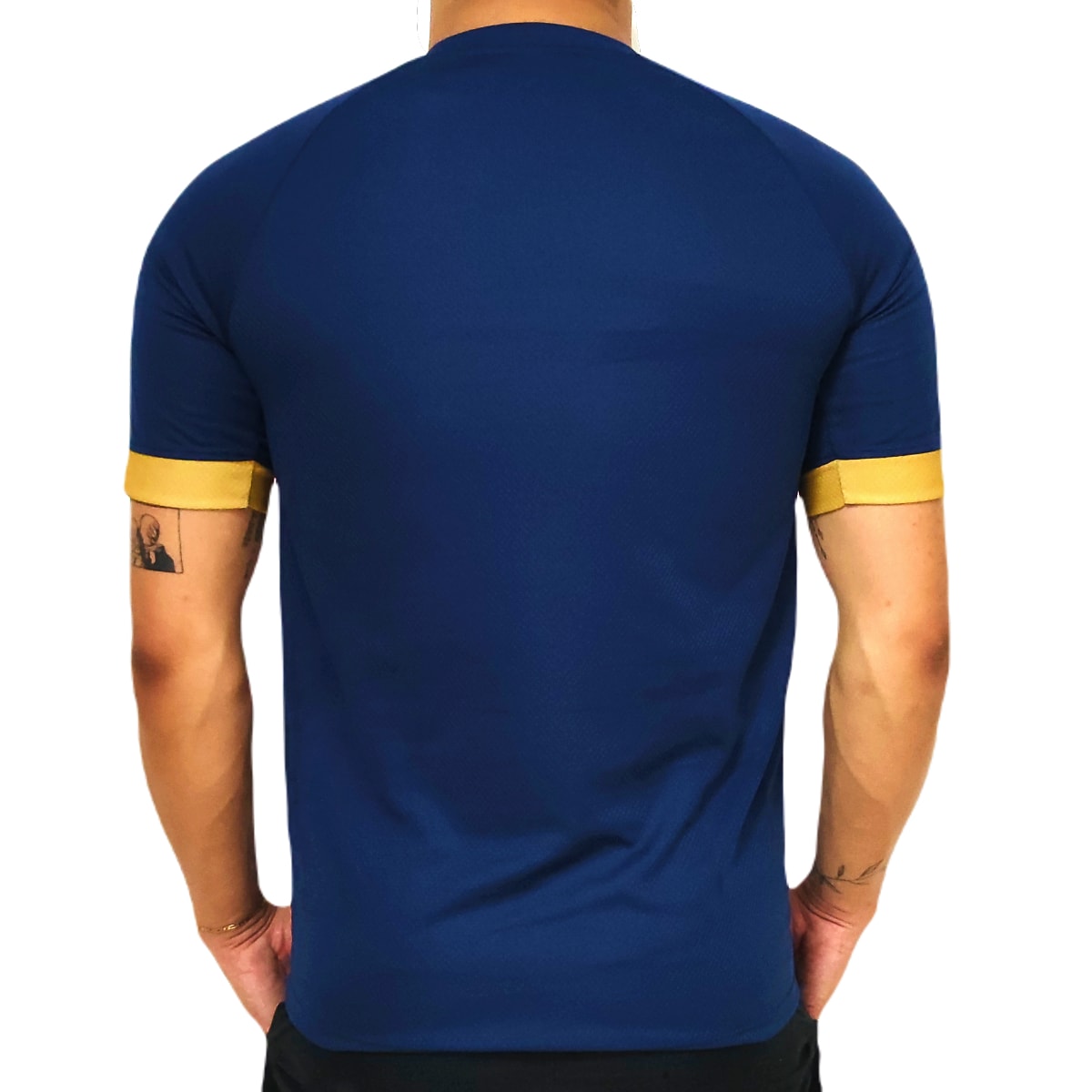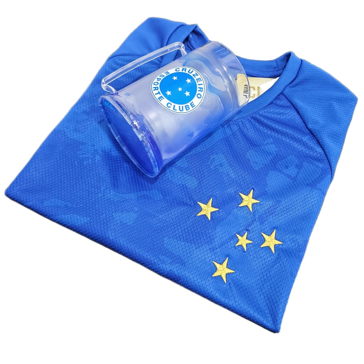 Produzida em 100% poliéster leve e respirável, a peça é azul com as estrelas do Cruzeiro em dourado bordado do lado esquerdo.